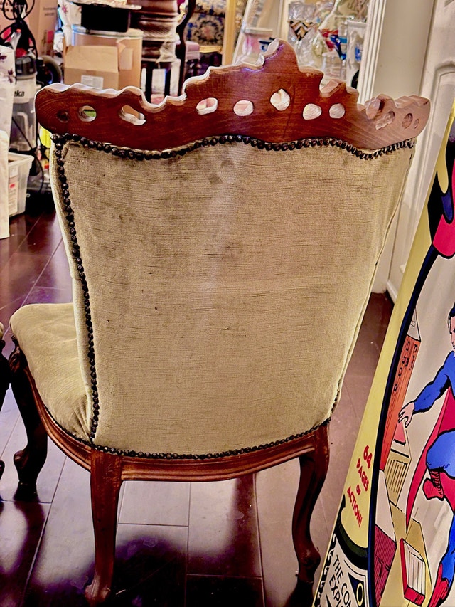 Beautiful set of 2 vintage chairs (52cm * 43cm * 90cm) featuring ornate carved wood frames and soft, button-tufted upholstery. These elegant pieces add classic charm and old-world character to any room or décor setting. For sale by owner.