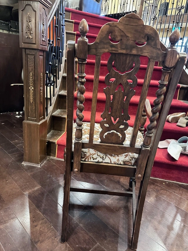 $320 for 2. A Tudor Revival style carved wooden chair with a floral upholstered seat. Dimensions are approximately 42cm * 42cm * 102cm. For Sale By: Owner