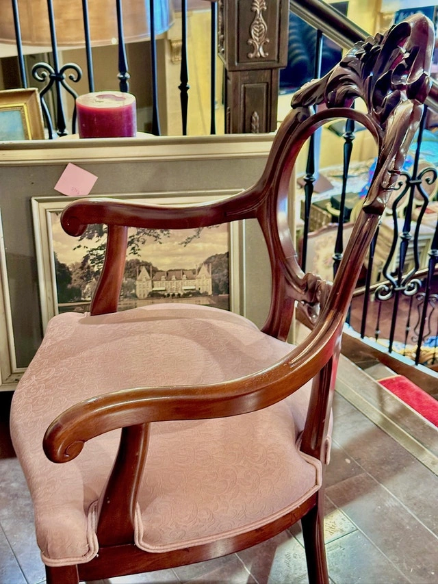 58cm * 52cm *108cm Elegant vintage carved wood accent chair featuring an ornate floral Rococo-style backrest and a softly patterned blush upholstered seat. A refined decorative piece that adds charm and sophistication to any room.