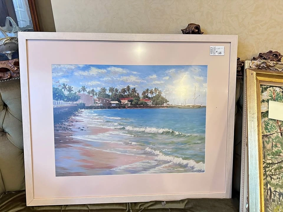 This large framed coastal artwork features a vibrant shoreline view with gentle waves, palm trees, and charming seaside buildings under a bright sky. It’s a beautiful piece that brings a relaxing beach atmosphere to any living room, hallway, or coastal-inspired décor.