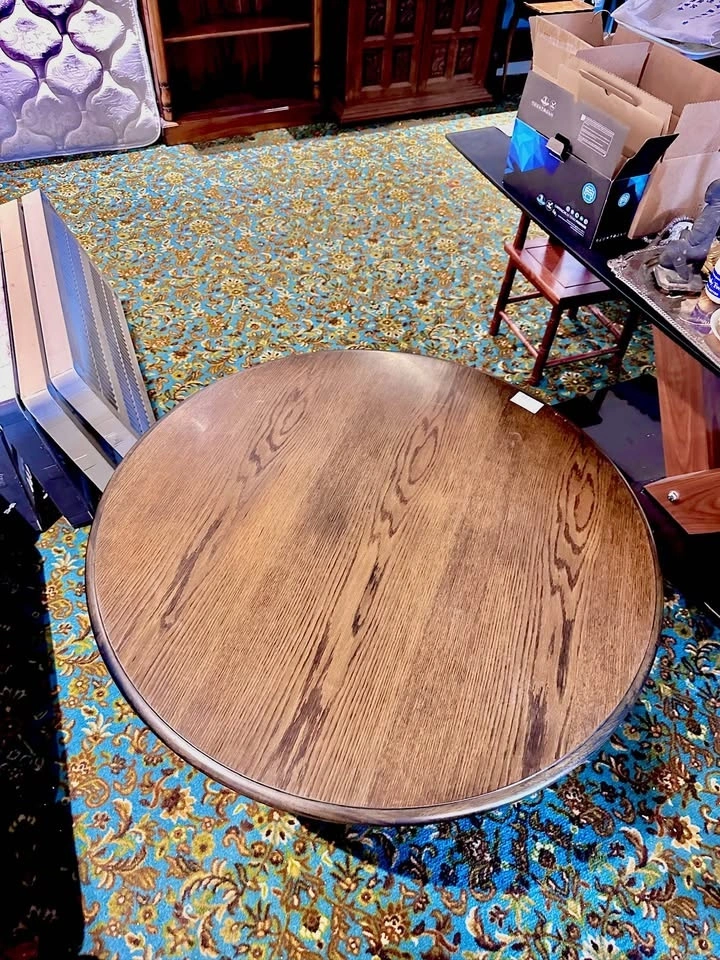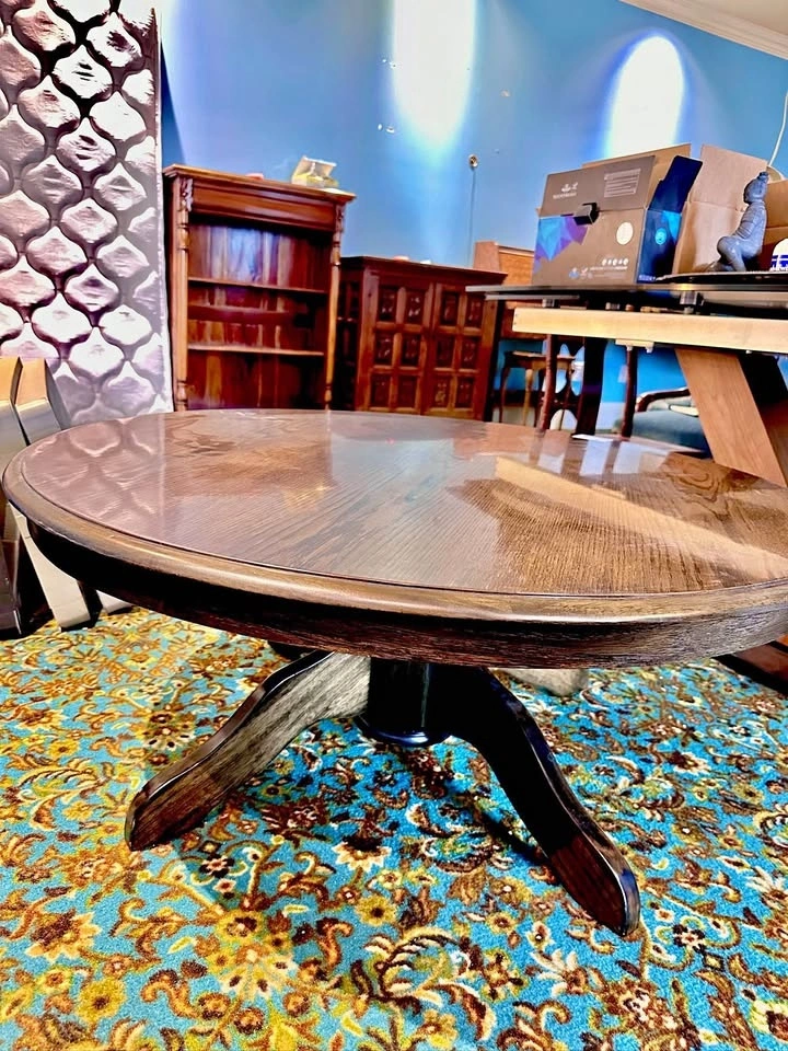 Beautiful round solid wood coffee table with a classic pedestal base and four sturdy legs. The wood grain on the tabletop looks great, and it has a warm vintage finish that suits traditional or retro-style interiors. Perfect for a living room or lounge area. Overall in good condition and ready to use. Welcome to check it in person — we are moving and have multiple furniture pieces for sale.