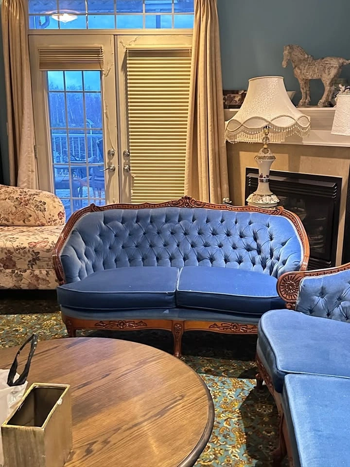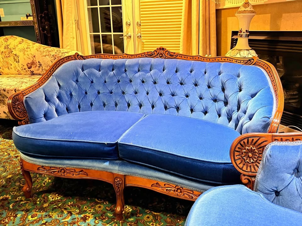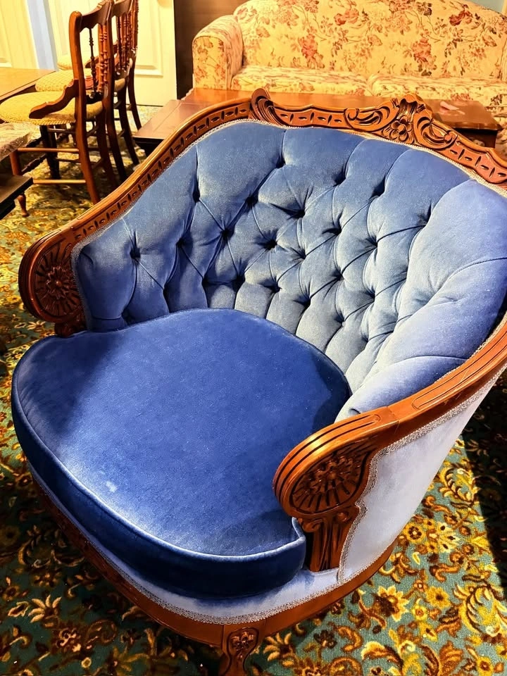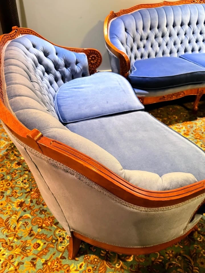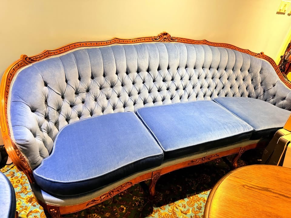 $500 for 3 Classic vintage sofa upholstered in rich blue fabric with deep button tufting and a carved solid wood frame. Elegant curved silhouette with detailed woodwork, showing light age-appropriate wear while remaining sturdy, comfortable, and well maintained. Moving Sale — Vintage Scandinavian Furniture (1970s–1990s)! We’re moving and letting go of our beautiful mid-century & Nordic design pieces — sofas, tables, shelves, and more. All in great condition, timeless and stylish. Perfect for vintage lovers or anyone decorating with character. Located in Richmond. Message for details & photos. All hand measure, might have 5cm differences.