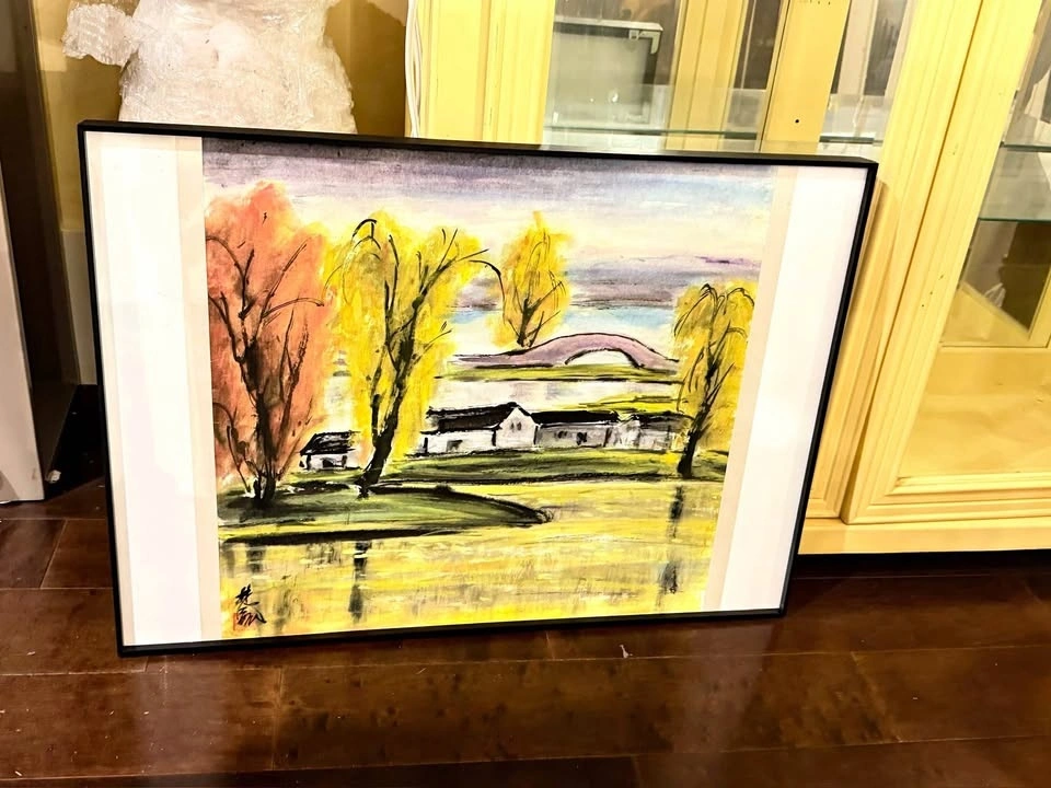 Expressive landscape artwork depicting trees, water, and distant buildings in warm yellow and autumn tones. Loose, painterly style with a calm, reflective mood. Presented in a simple black frame; suitable for living rooms, offices, or entryways. Condition consistent with gentle display use.