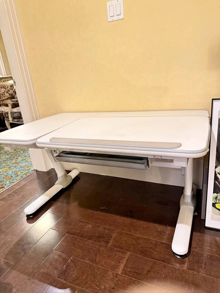 Clean, modern desk with a white finish and gently angled work surface, suitable for writing, studying, or drafting. Simple, functional design with a compact footprint; shows light surface marks consistent with normal use. Ideal for home offices, study rooms, or creative spaces.