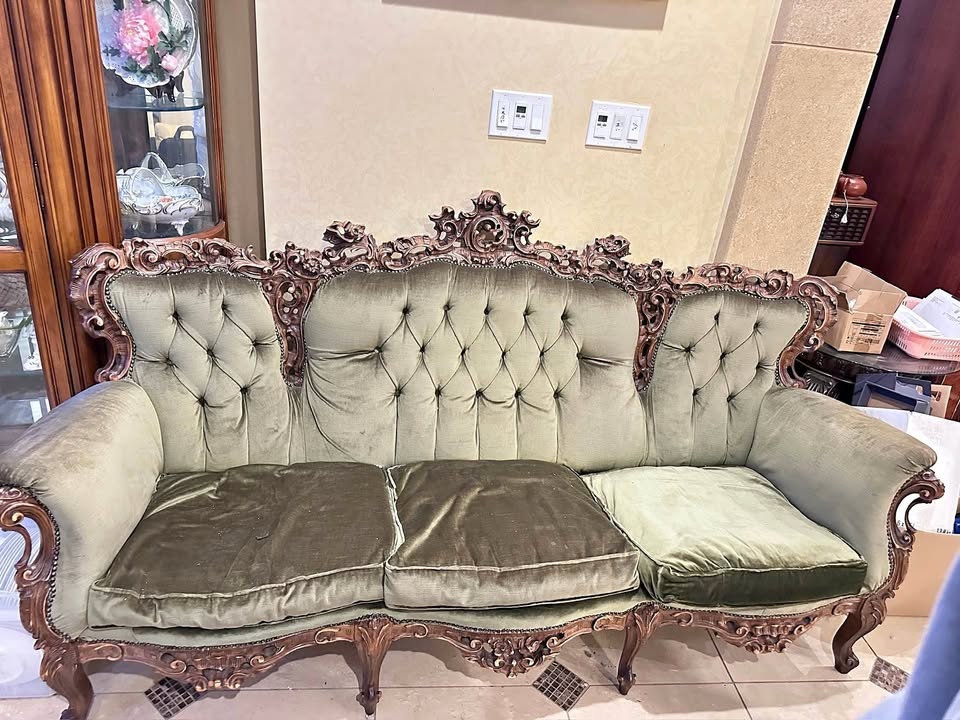 Ornate three-seat sofa with richly carved wood frame and tufted upholstery in a muted sage/olive tone. Classic Victorian styling with detailed scrollwork and cabriole legs; sturdy and comfortable, showing visible wear and fading consistent with age and use. Suitable as a statement or restoration piece.