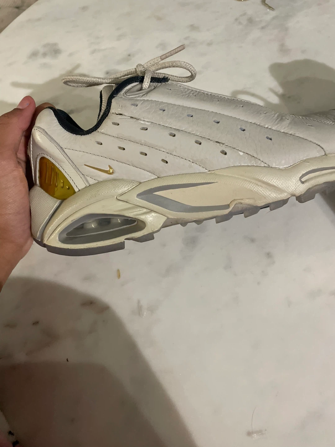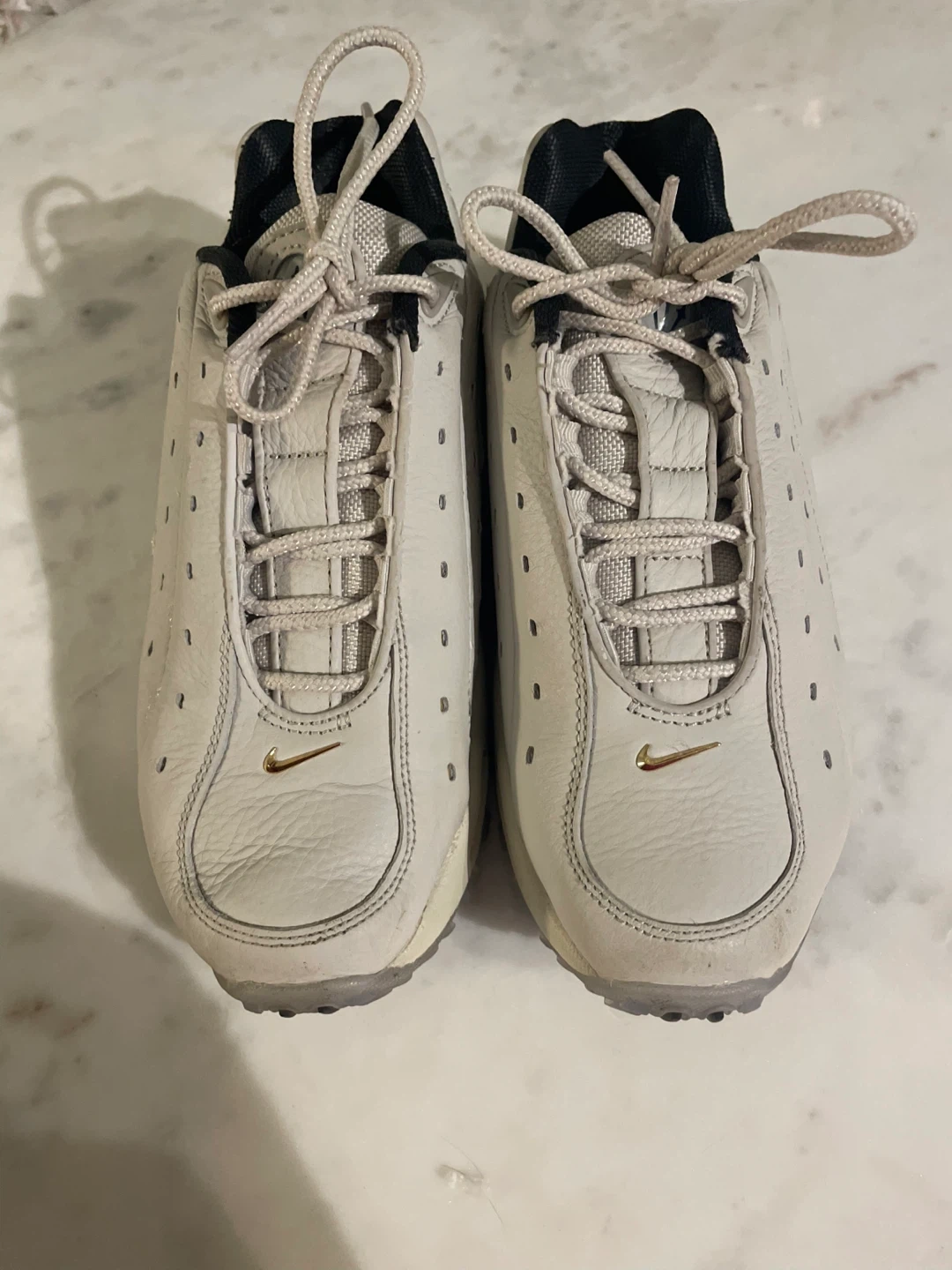 Nike x Nocta 'Hot Step Air Terra' Sneakers in monochromatic white leather colourway with perforated detailing, gold metallic dealing and a round toe. Features front lace-up fastening, rubber sole and a signature swoosh logo detail.