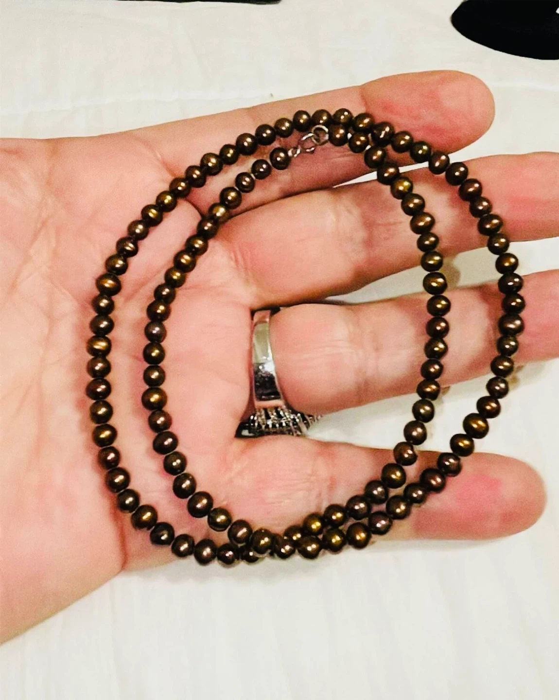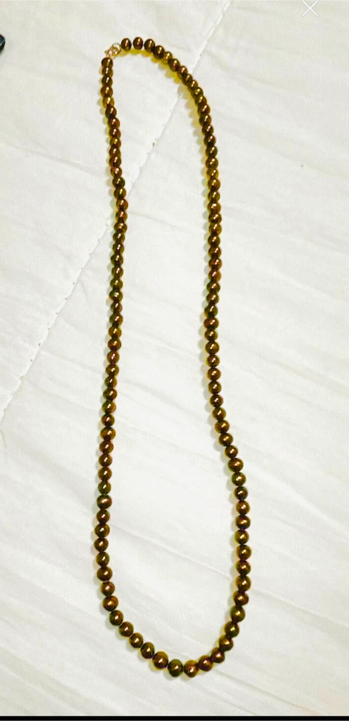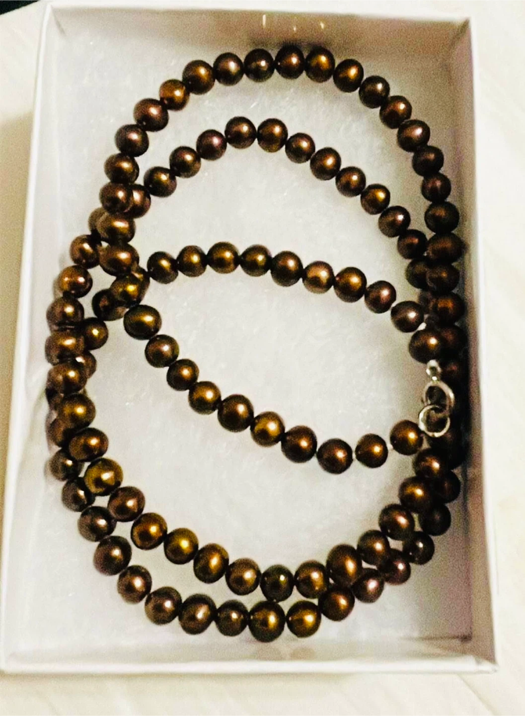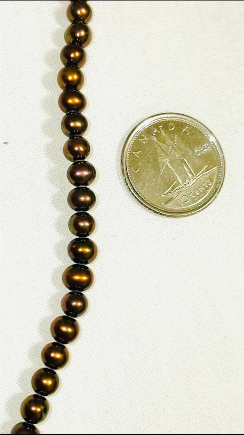 This is a lovely Genuine Brown 4.5-5 mm cultured freshwater pearls necklace with sterling silver accents. It comes in its original box with tag and is in great condition. Perfect for adding a touch of elegance to any outfit