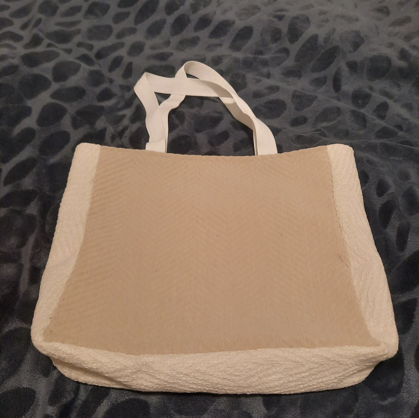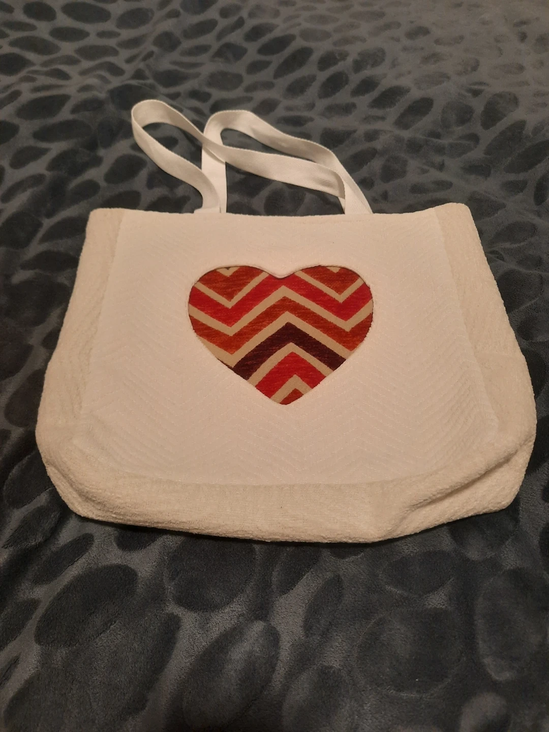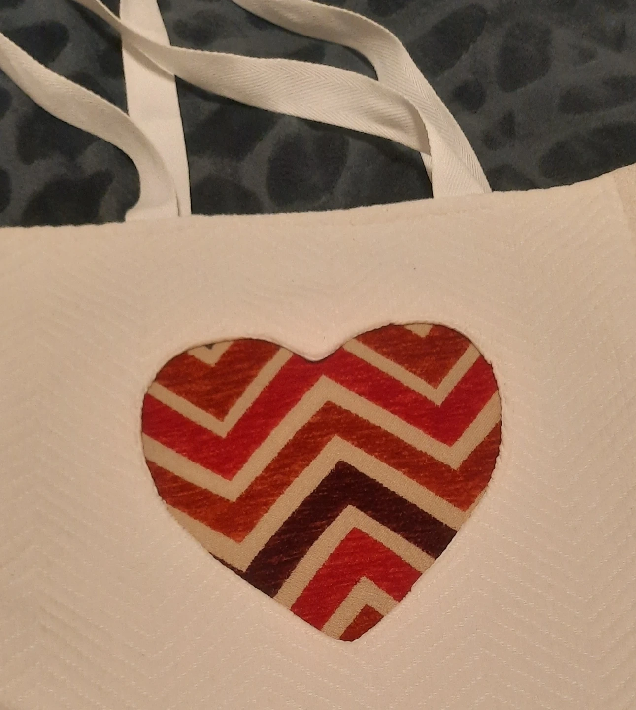 This white tote bag is my handmade, features a unique heart design with warm, inviting colours. It's perfect for shopping, carrying books, or just adding a little flair to your outfit or as a gift ๐
