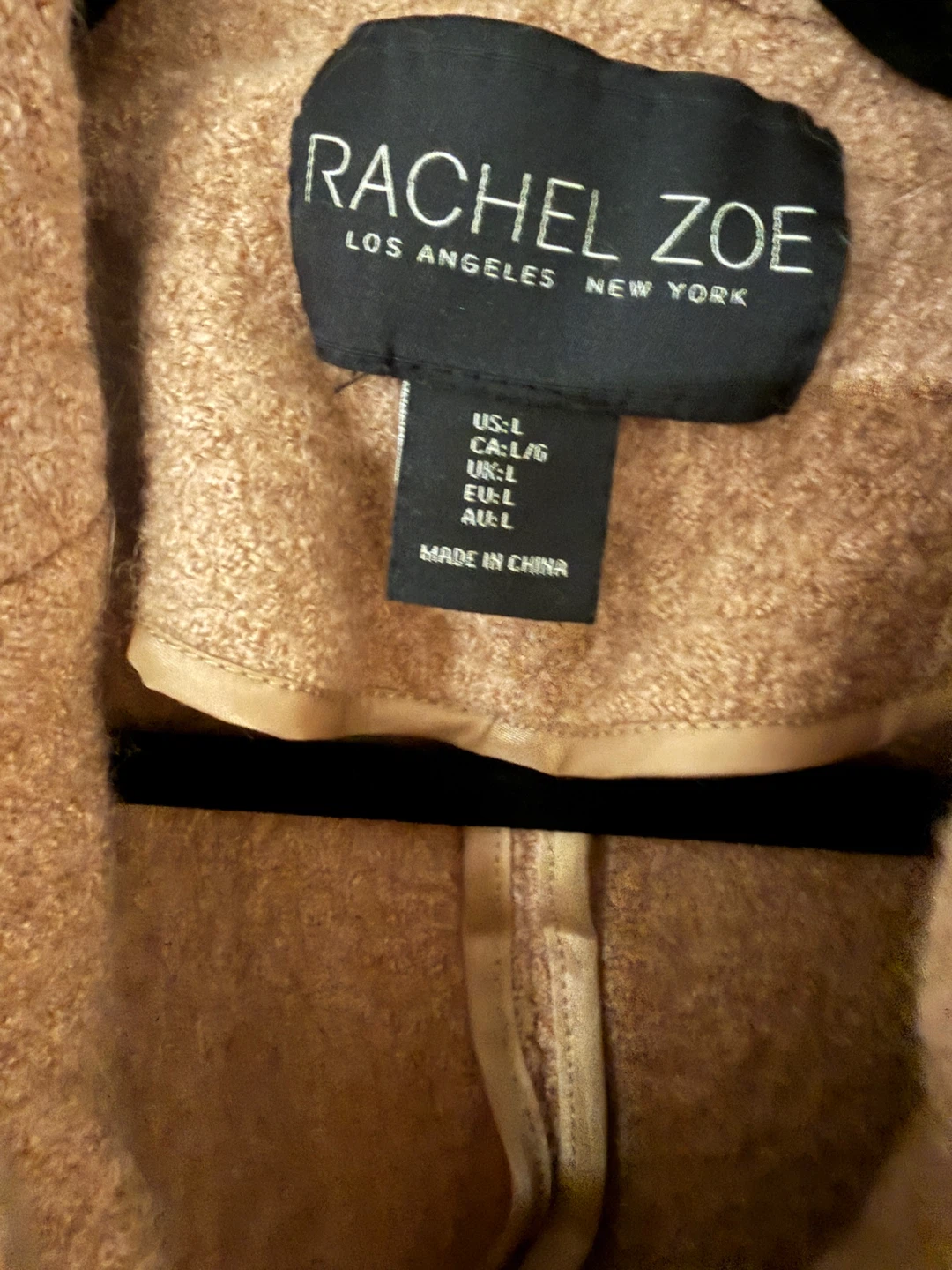 Giving away a Rachel Zoe women's coat in size L. It's a stylish and cozy coat perfect for cooler weather. The coat features a button closure and a textured design. Feel free to reach out if you have any questions!