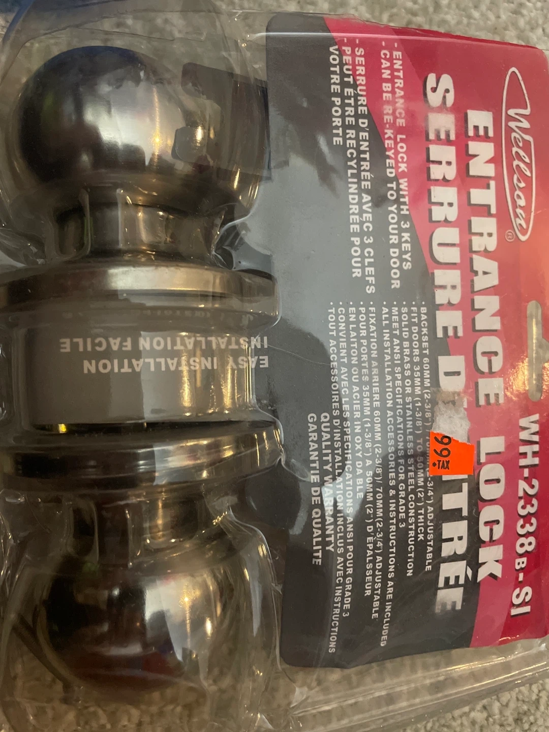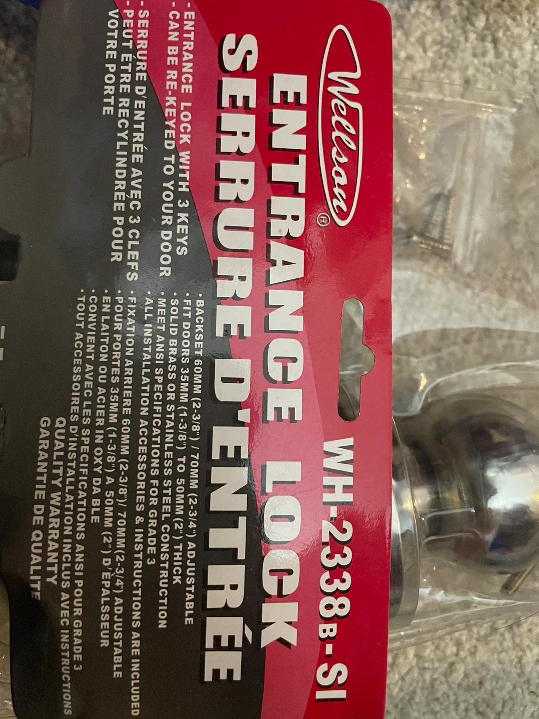 Selling a Wellson Entrance Lock (model WH-2338B-S1)! It's an entrance lock with 3 keys. It can be re-keyed to your door. It fits doors 35mm (1-3/8") to 50mm (2") thick, and solid brass or stainless steel construction. All installation accessories and instructions are included.