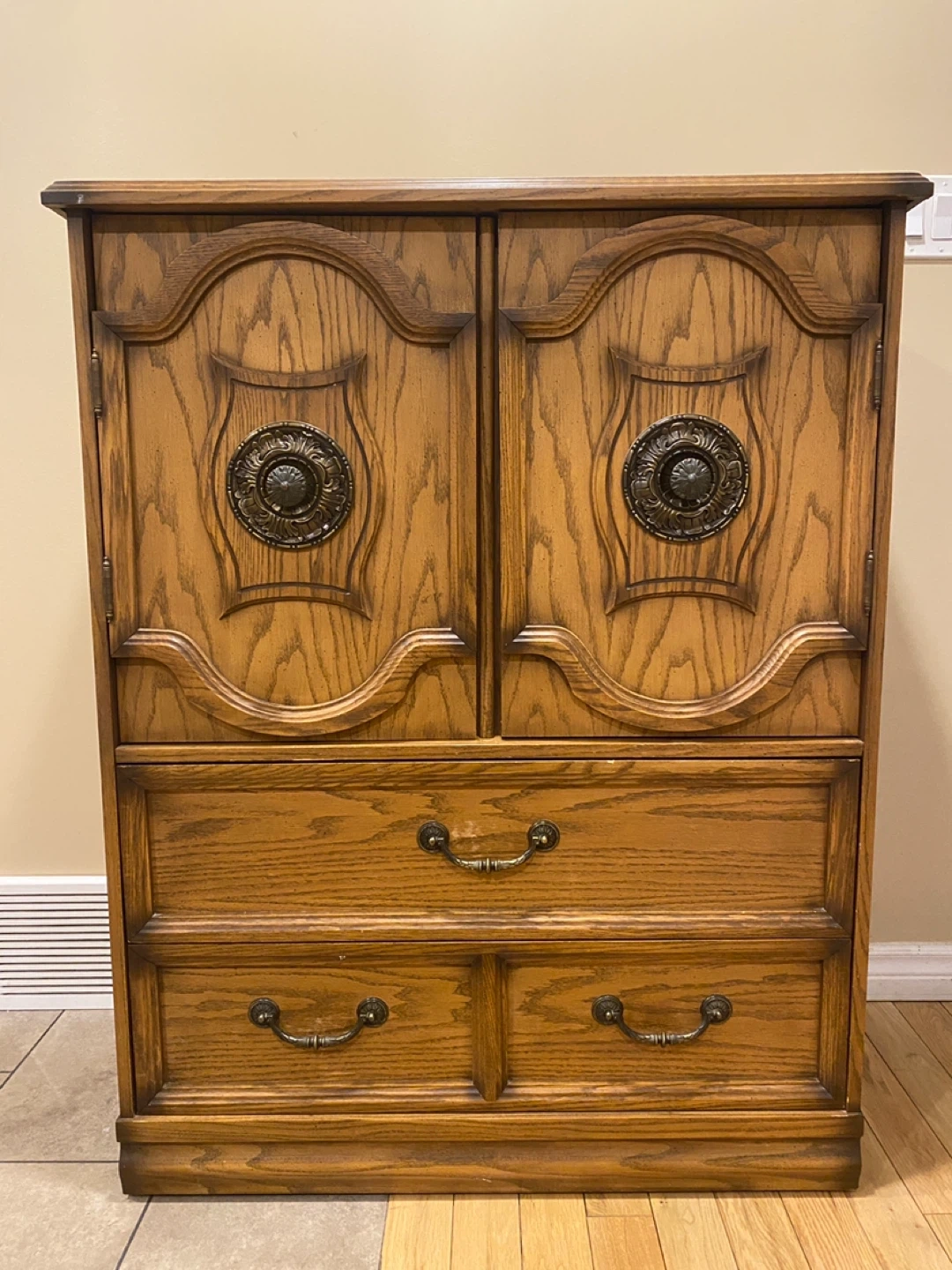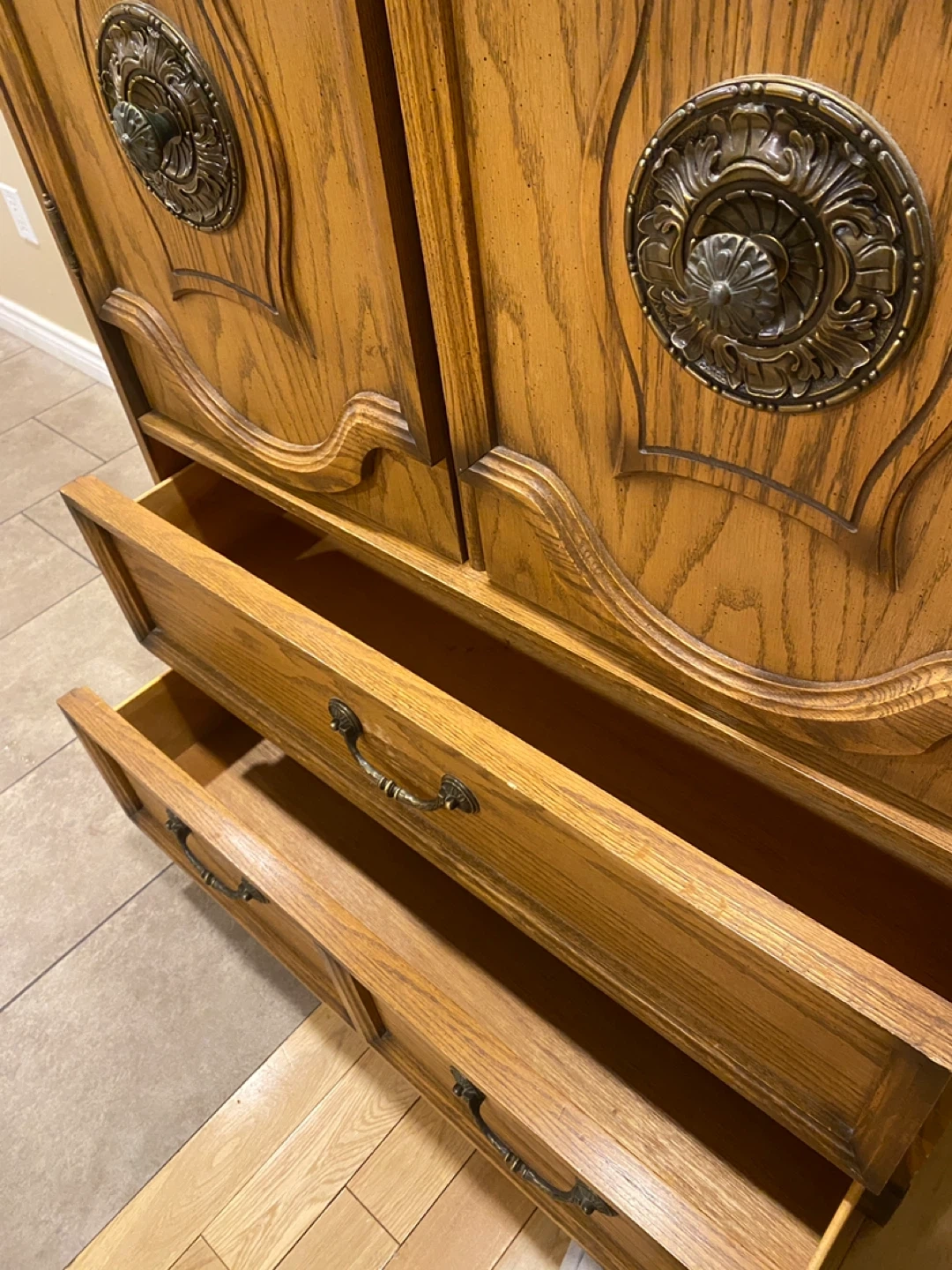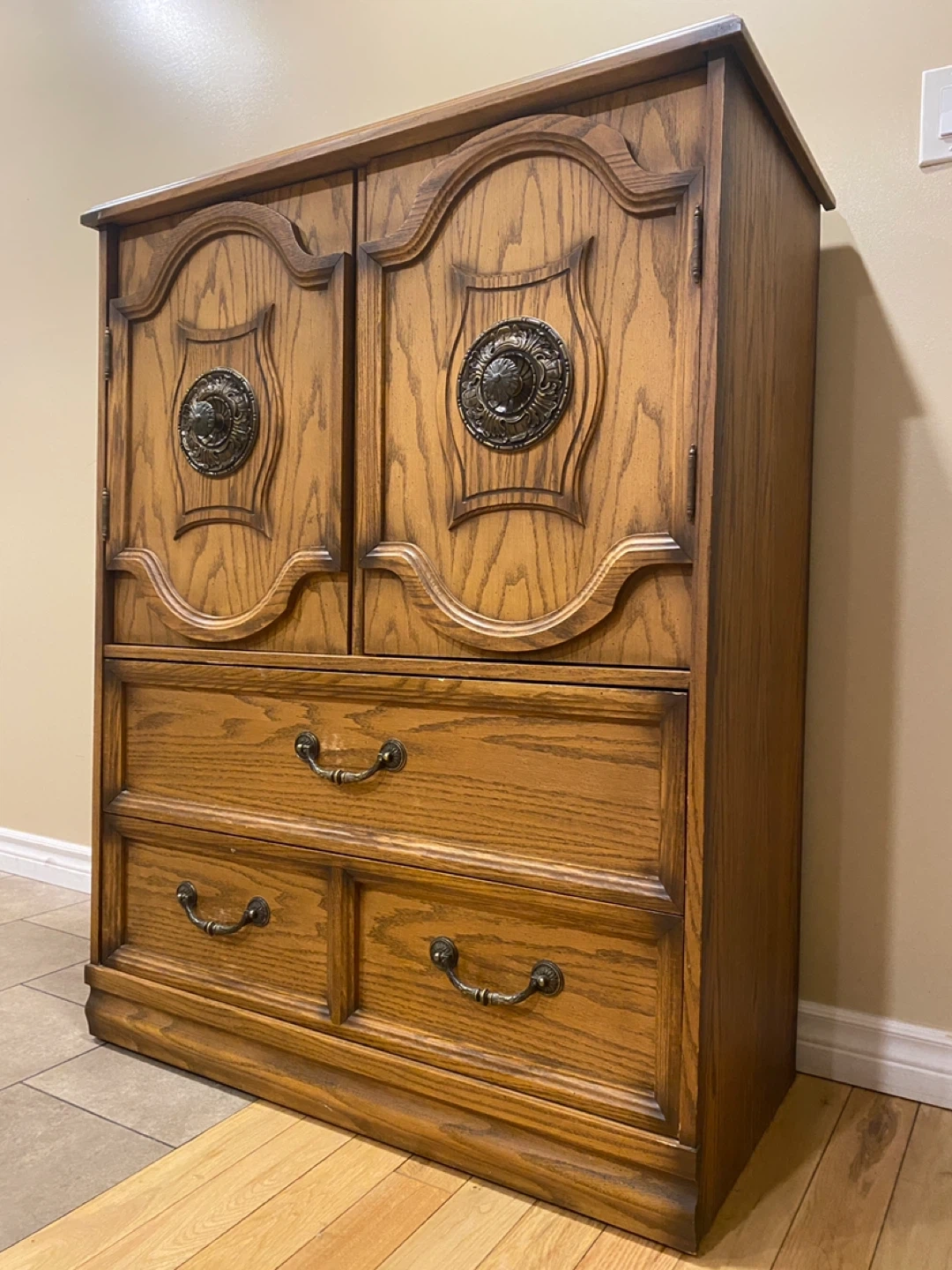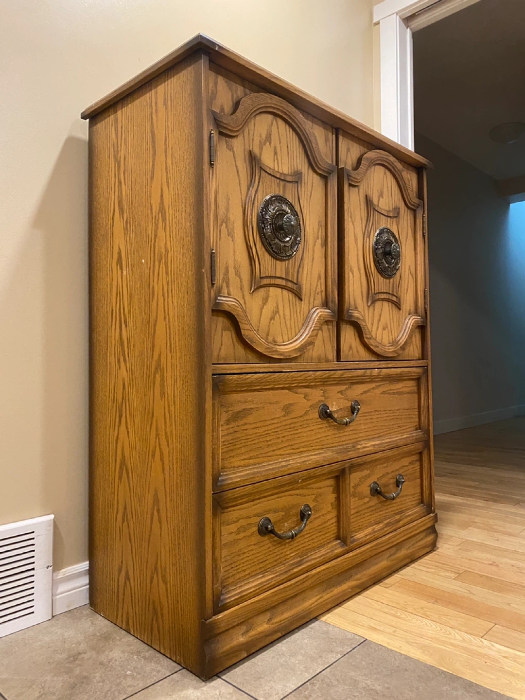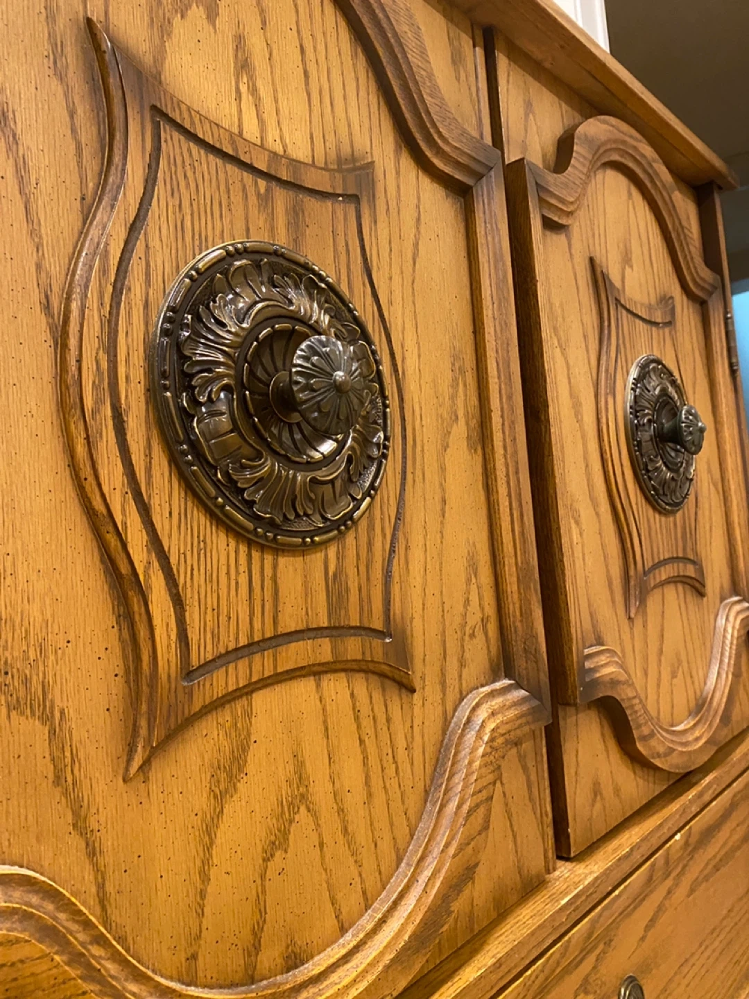 Elegant vintage oak armoire featuring rich carved details, decorative antique brass bail pull handles with rosette backplates, and well-built storage solutions.