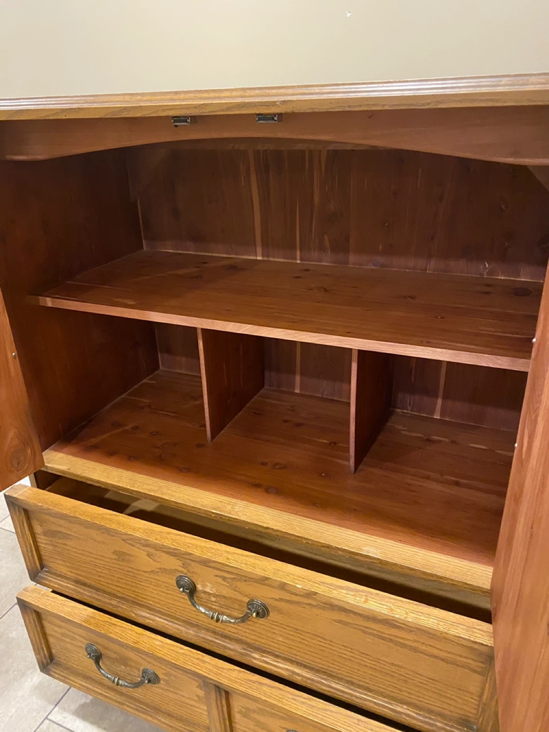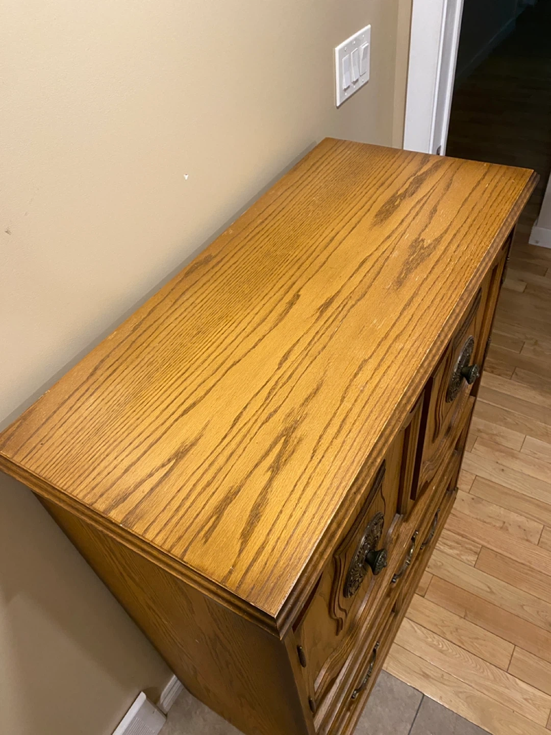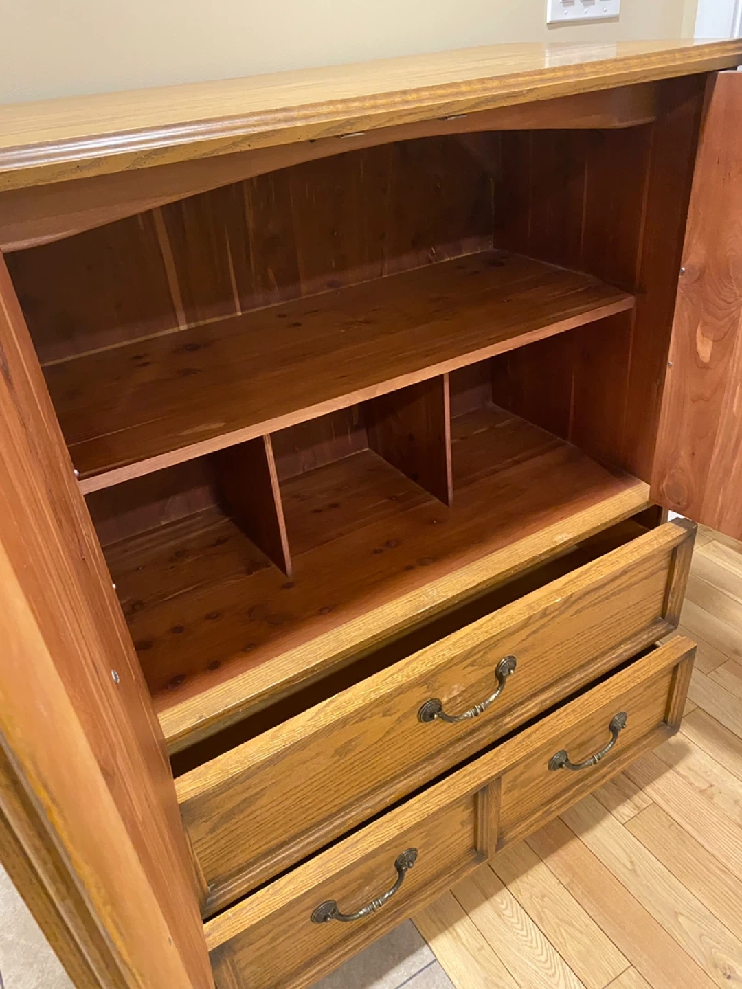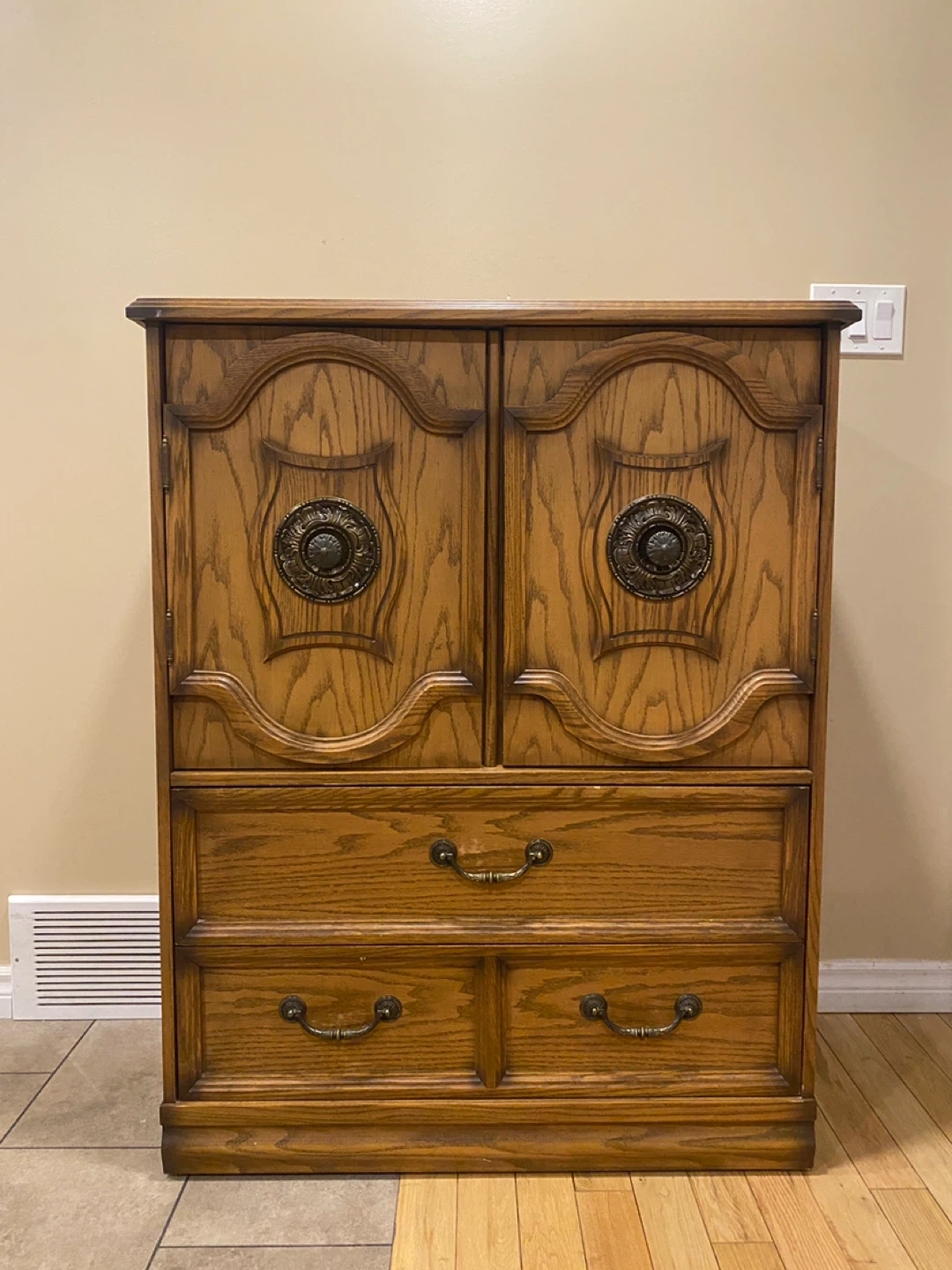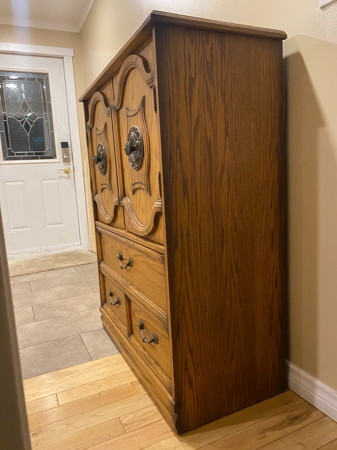 Elegant vintage oak armoire featuring rich carved details, decorative antique brass bail pull handles with rosette backplates, and well-built storage solutions.