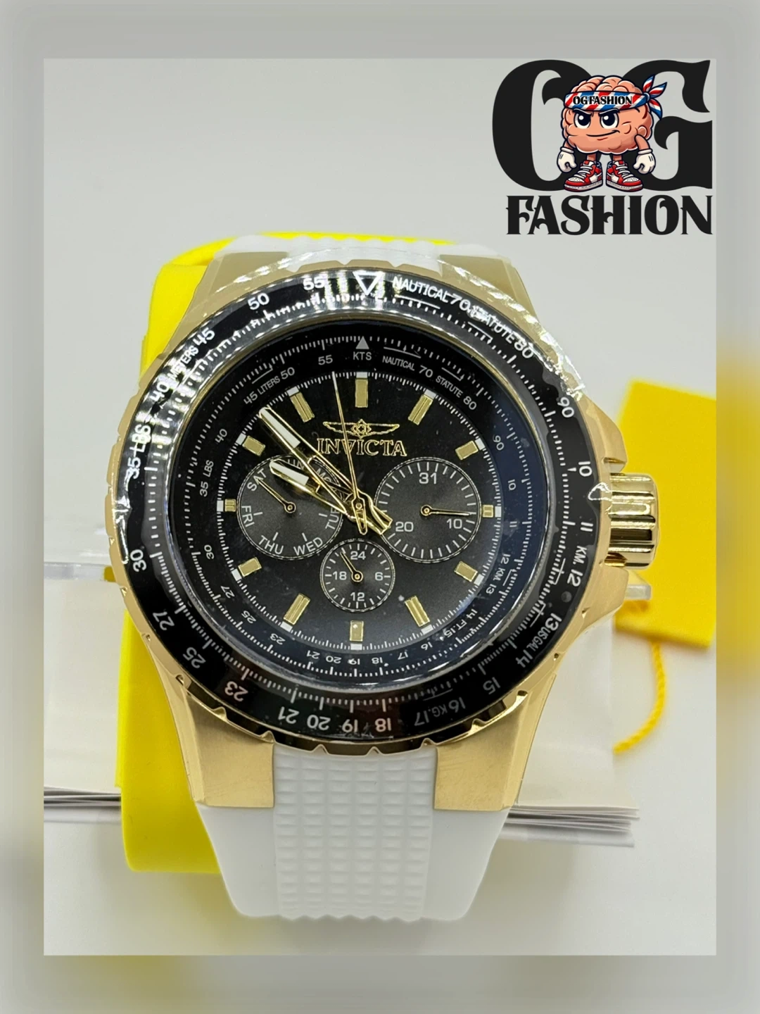 Eye-catching gold-tone case with black dial and white silicone strap.