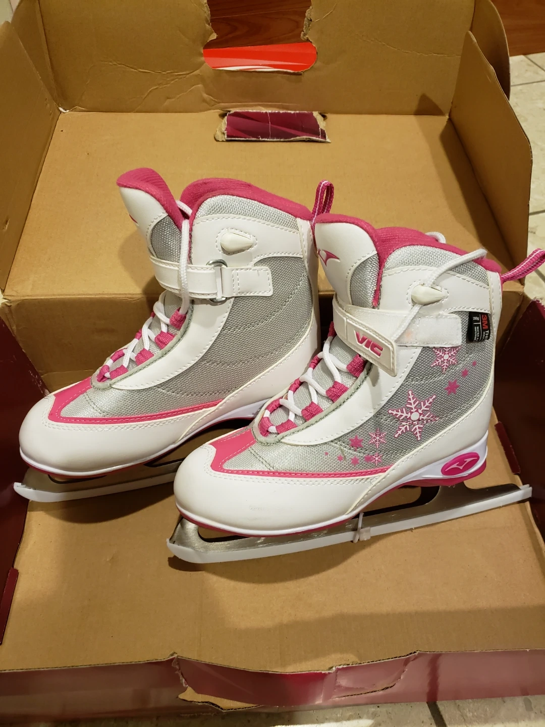 Selling a pair of VIC ice skates in white and pink! They come in the original box (size US J2). Perfect for some fun on the ice this winter season