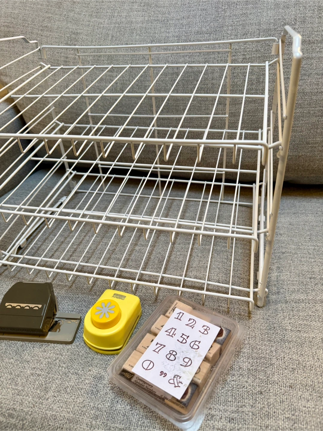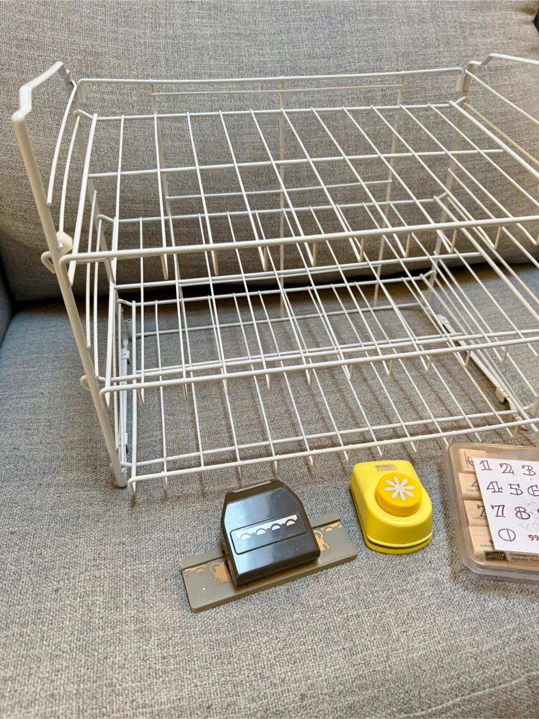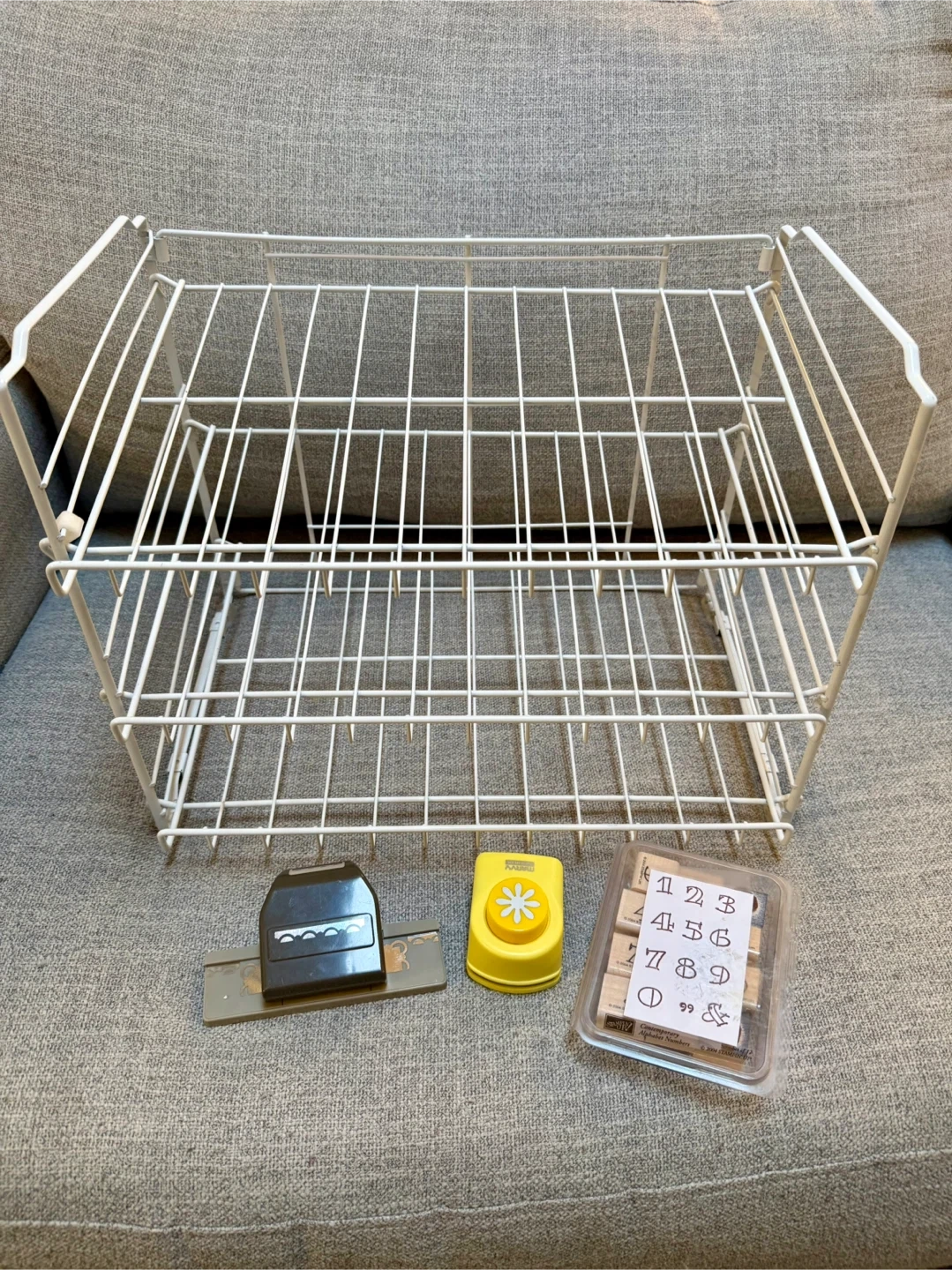 Selling a white wire storage rack, perfect for organizing your craft supplies or other items. Also included are a couple of craft punches and a set of number stamps! Great for scrapbooking or card making