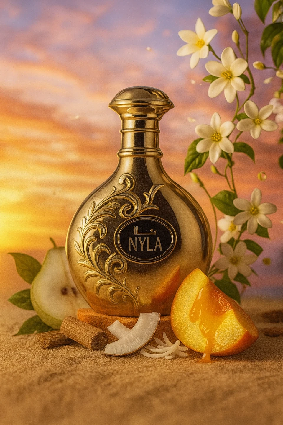 NYLA opens with luscious top notes of juicy pear, fig drizzled in honey, and coconut, evoking a tropical escape. At its heart, delicate white jasmine petals bloom, adding a floral softness that’s both romantic and radiant. The base settles into warm vanilla, citrus zest, and woody undertones, creating a long-lasting trail that’s irresistibly smooth and refined.