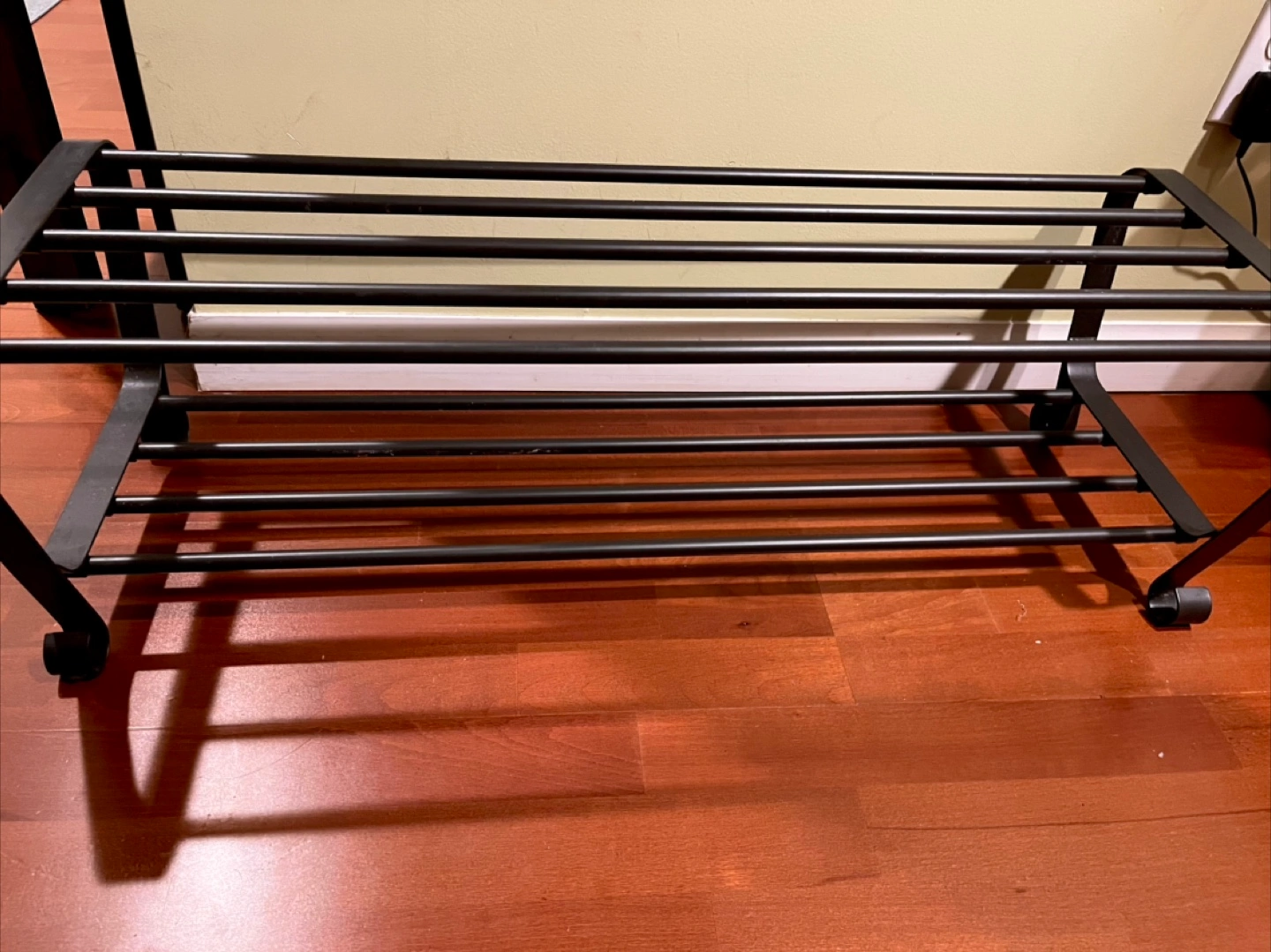 Here's a sturdy black metal shoe rack, perfect for keeping your entryway organized! It's in great shape and ready to hold all your footwear. A simple and practical solution for shoe storage. Fits about 10-15 pairs of shoes. Measurements upon request.