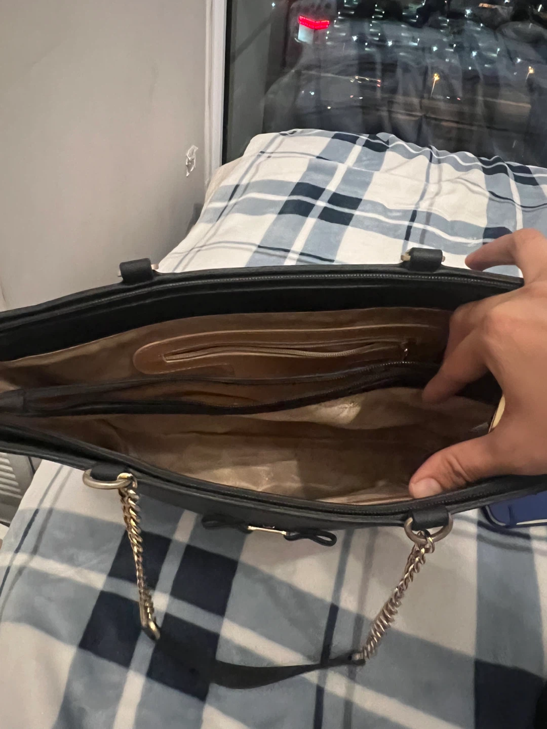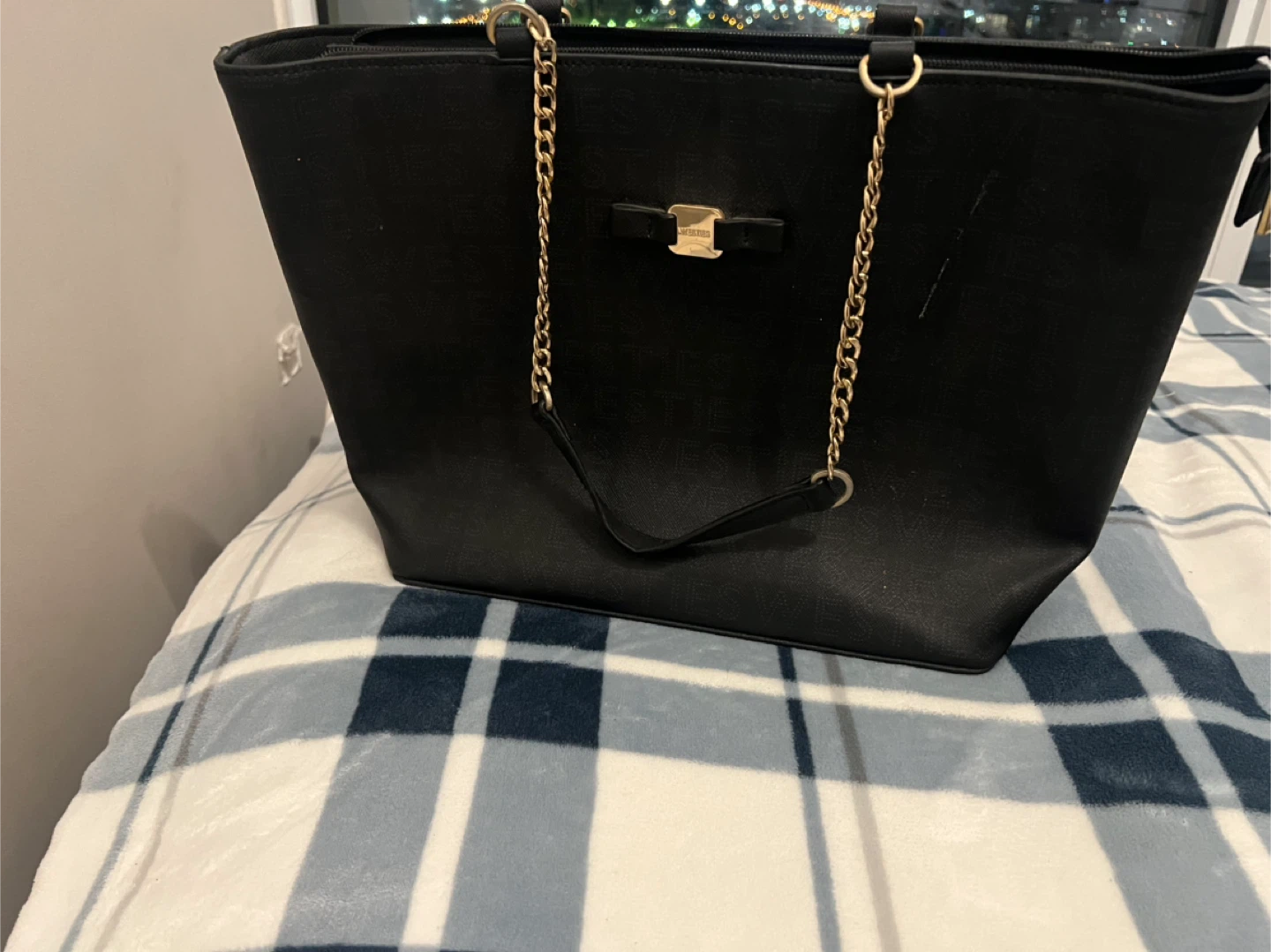 This is a black Westies tote bag. It features gold chain detailing and a bow accent. It's a stylish and practical bag for everyday use
