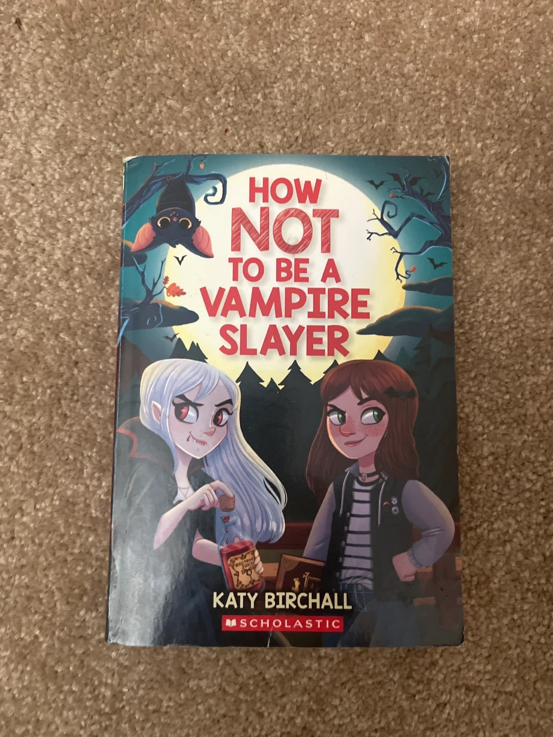 Selling the book 'How Not to Be a Vampire Slayer' by Katy Birchall! It's a fun read about Maggie Helsby and her adventures in the town of Goreway. She moves into a spooky house and discovers a secret coven of vampires. Perfect for anyone who enjoys a bit of mystery and humour!