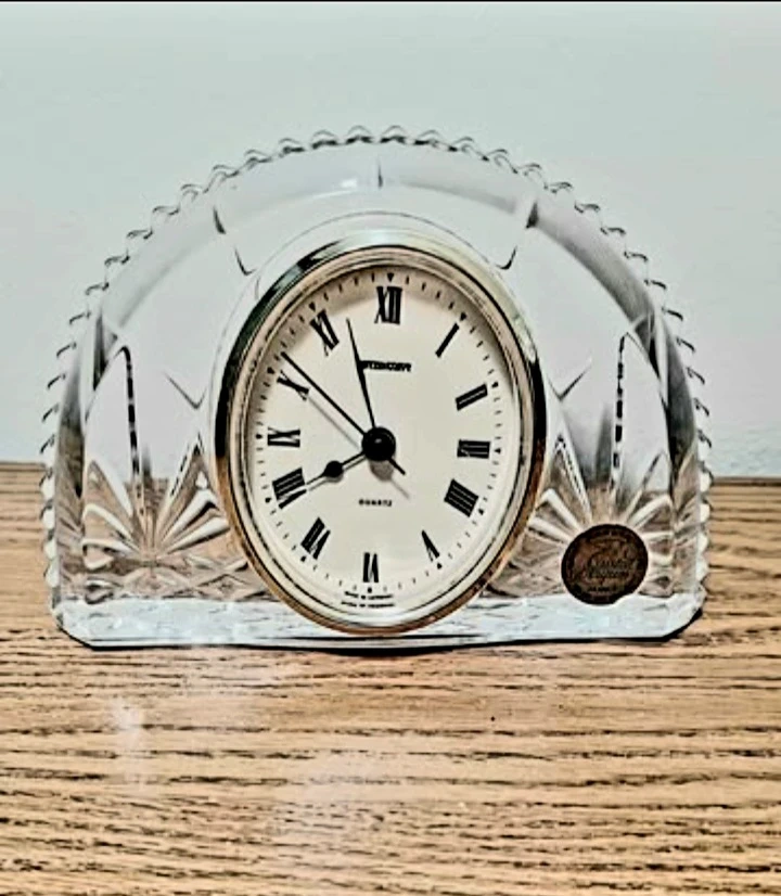Add a touch of elegance to your space with this exquisite Cristal D'Arques France Crystal Clock, featuring a Sophisticated Oval face with Roman numerals. A treasure on any mantel or desk.