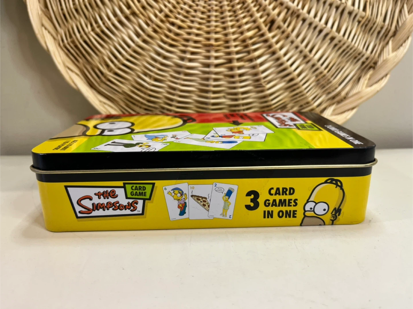 The Simpsons 3 Card Games in One! Includes 56 Cards. Game includes: Bad Memory, Cheat, Crazy Eats. Ages 5 to Adult, 1 to 4 players. The Simpsons cards feature characters from the TV show: Homer, Marge, Bart, Lisa, Maggie, Mr. Burns, Chief Wiggum, and Apu. The Tin box is included