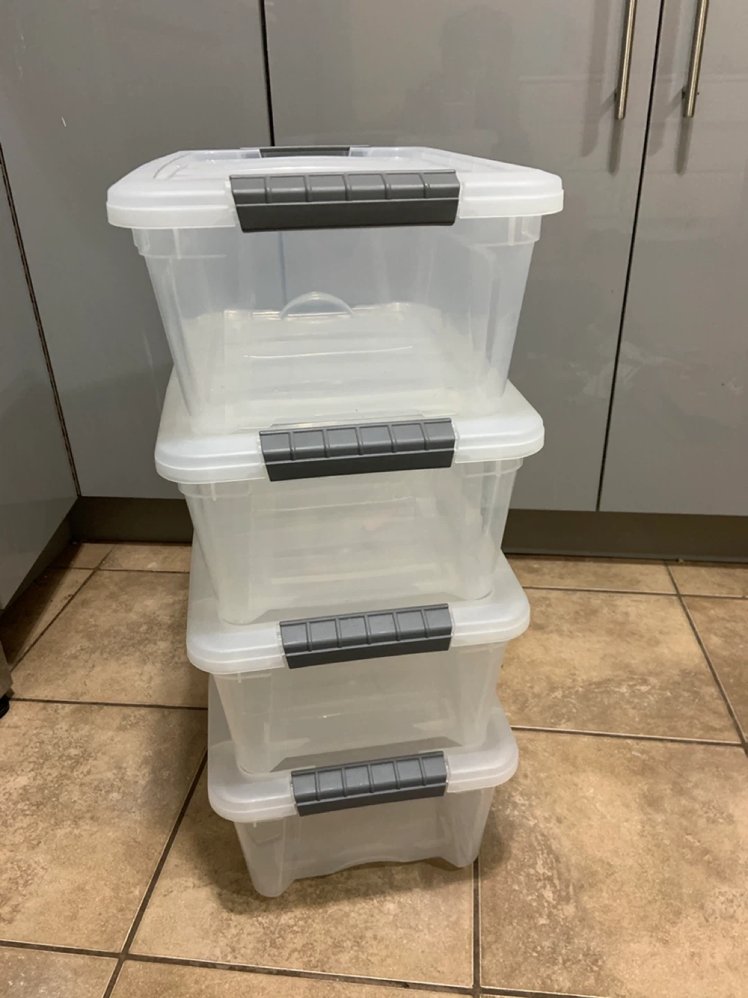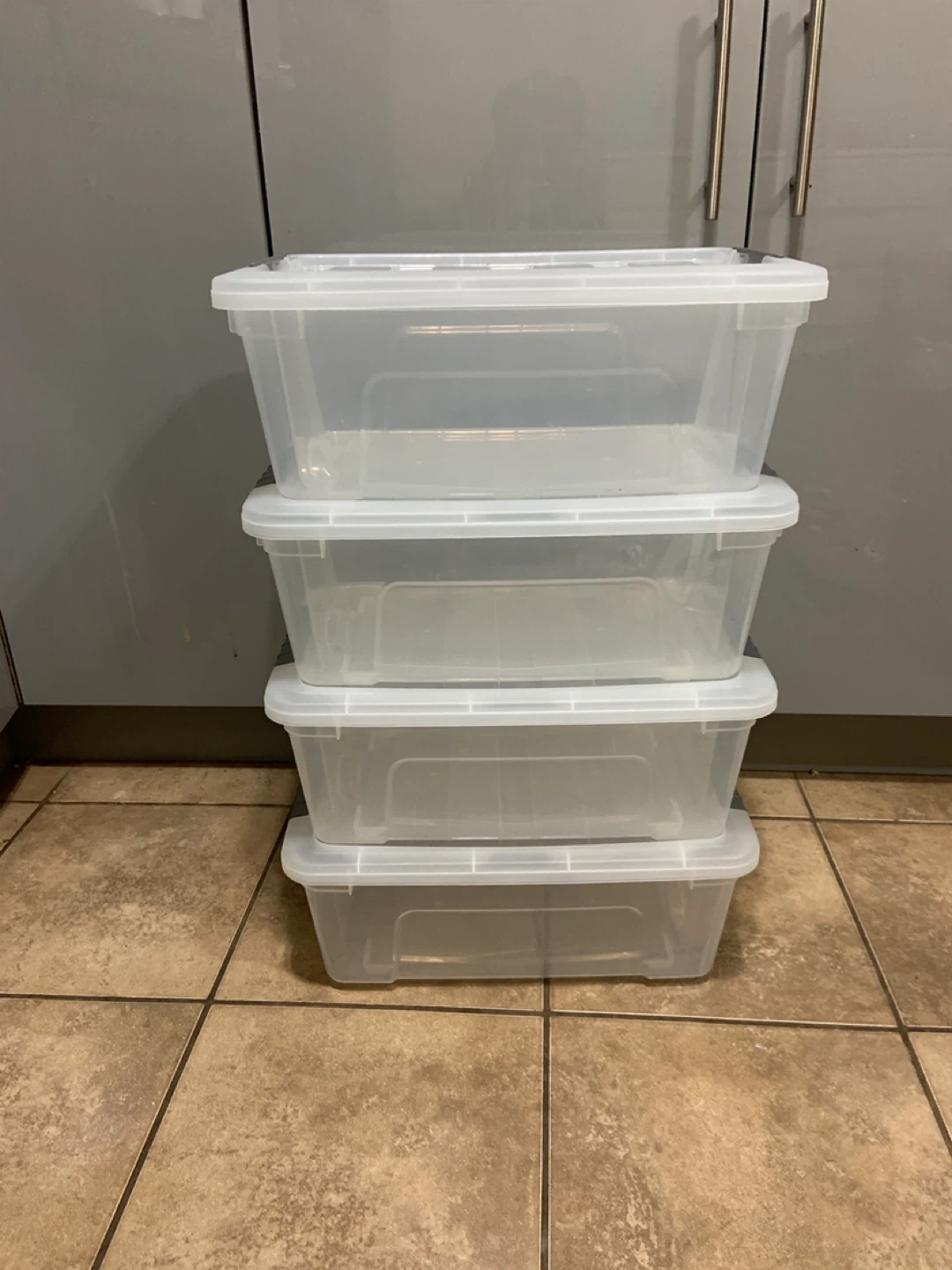 Selling a set of 4 clear plastic storage bins. They come with grey lids that snap securely shut. Perfect for organizing your home!