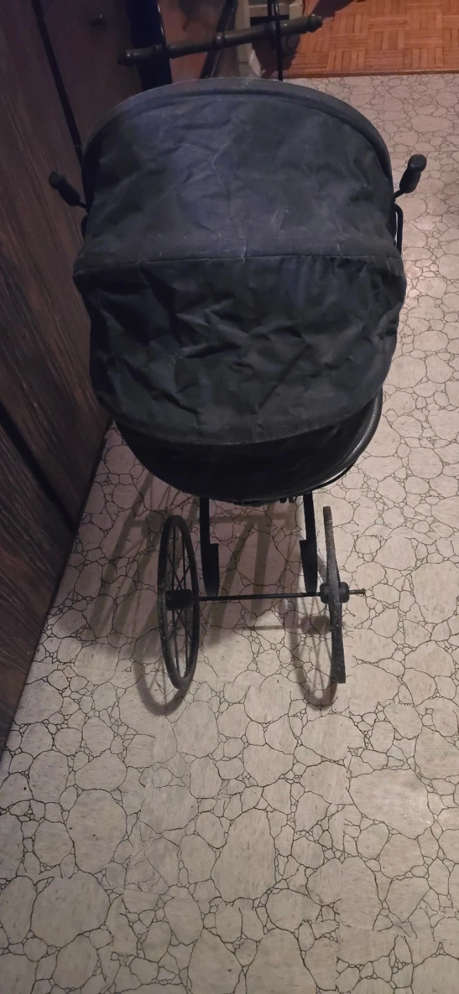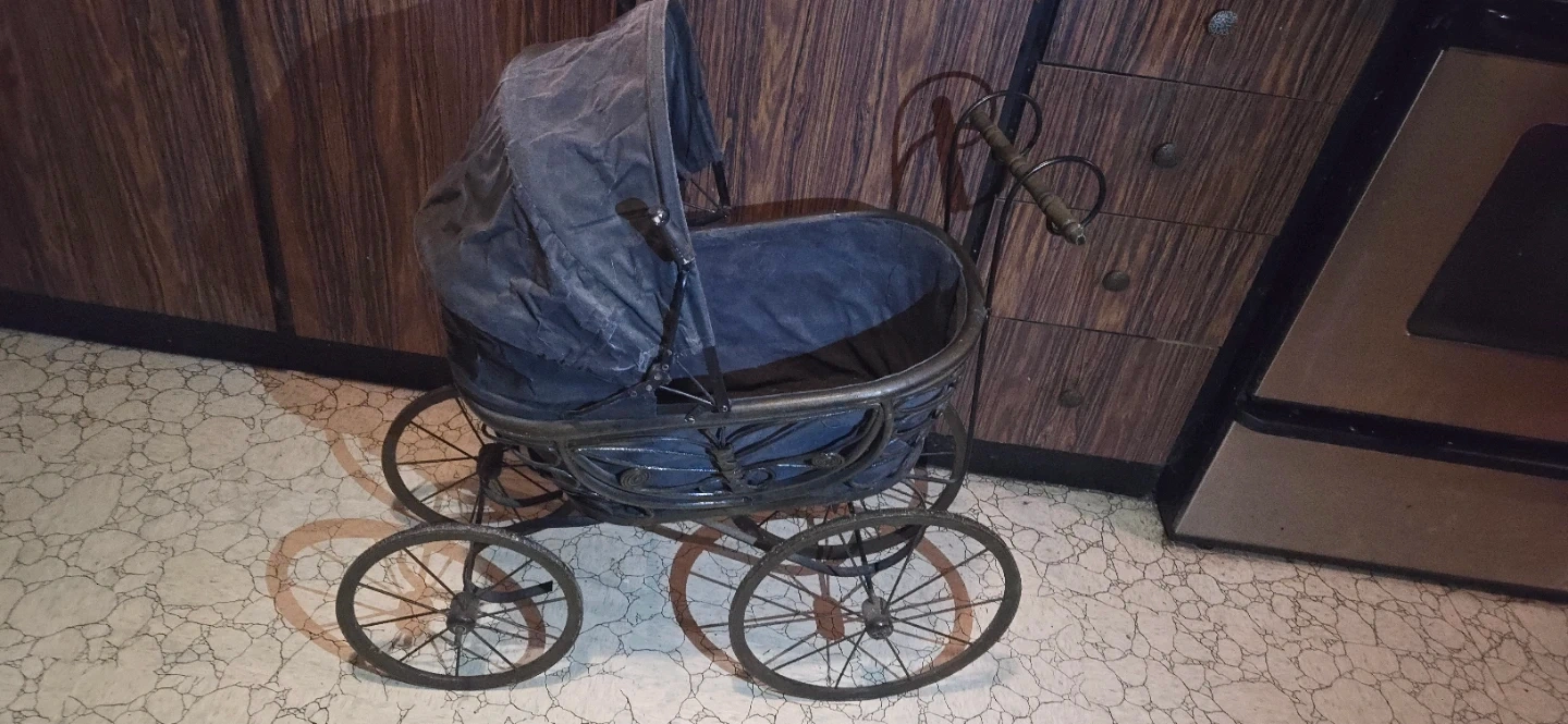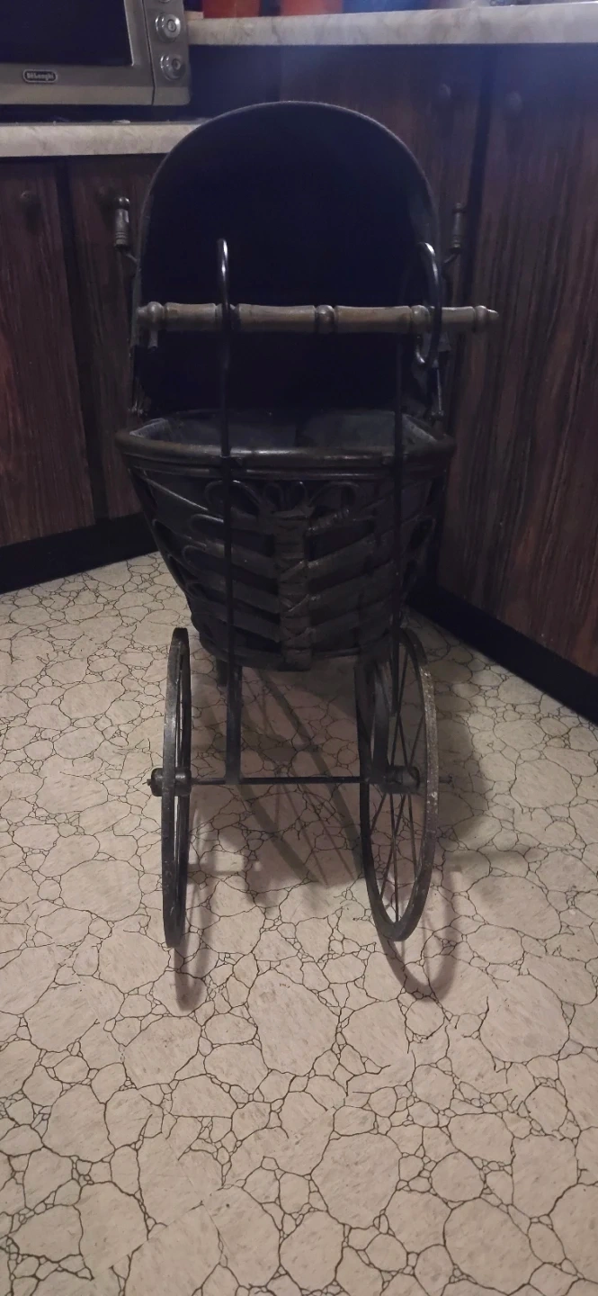 Selling an antique-style baby carriage. It's a unique piece that could be used as a decorative item or for display. The carriage has a vintage look with spoked wheels and a fabric cover. It shows some signs of wear consistent with its age, but it still has a lot of charm!