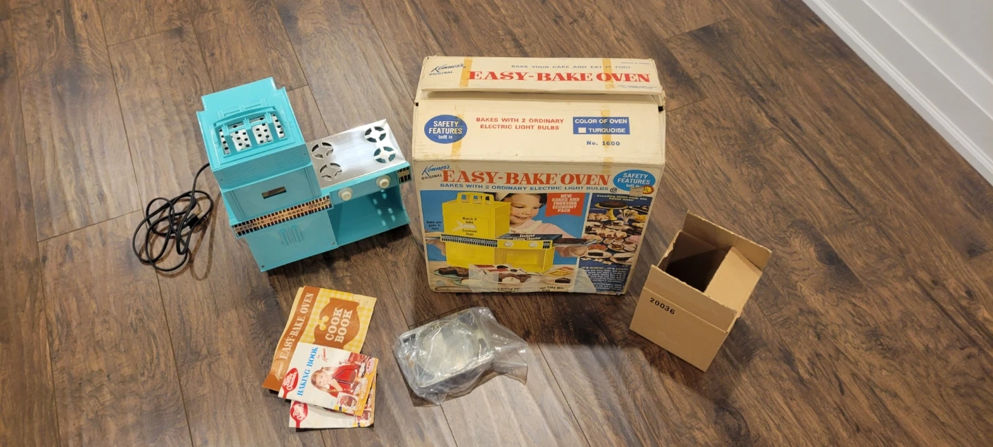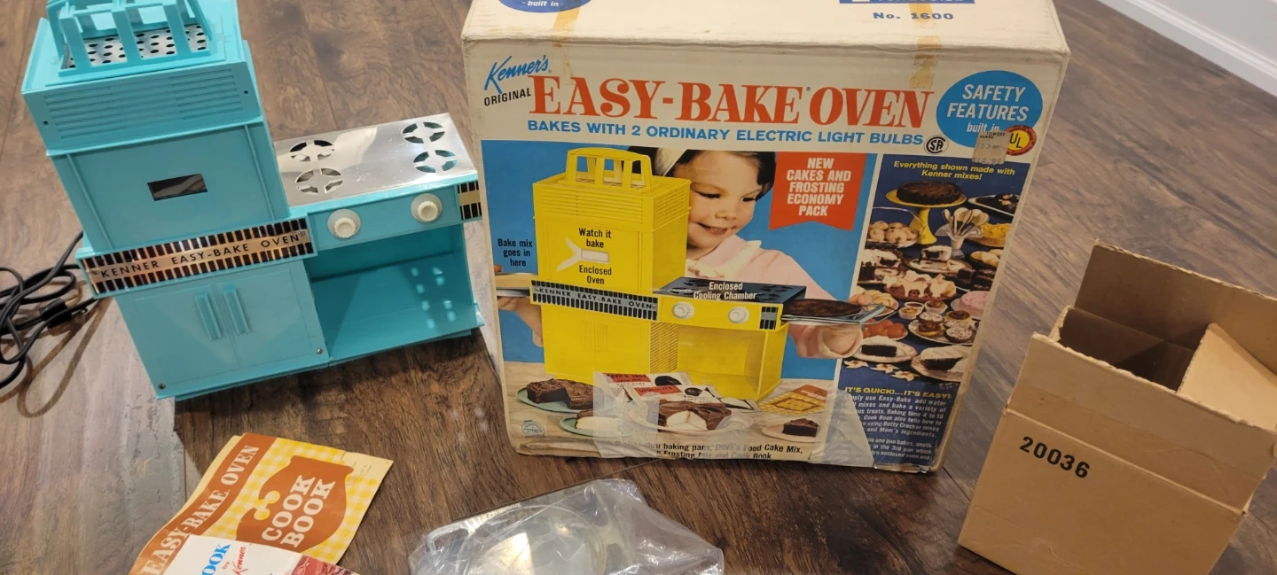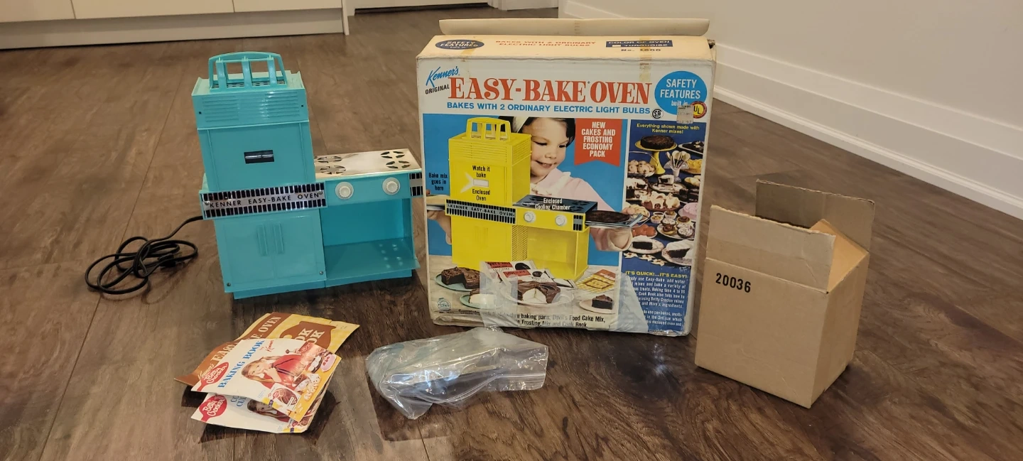 Selling a vintage Kenner Easy-Bake Oven! It comes with the original box and some accessories, including the cookbook. A great piece for collectors or anyone looking for a bit of nostalgia.