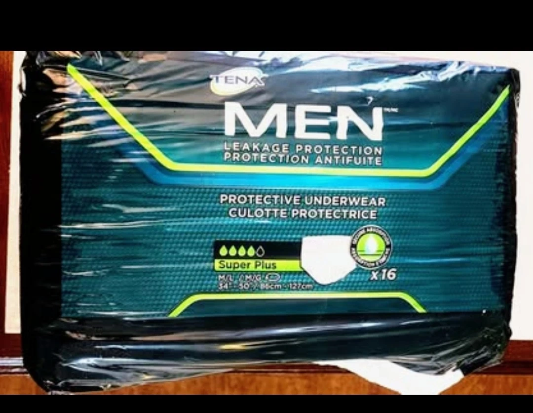 Selling a pack of Tena Men Leakage Protection Protective Underwear. This is the Super Plus absorbency level, and the size is M/L (34"-50" / 86cm-127cm). It comes with 16 pairs of underwear in the package