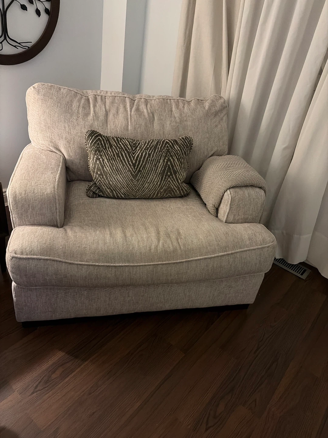 Cozy beige armchair perfect for any living space! The chair is in great condition and ready to add some comfort to your home. It is barely been used or sat on. Bought three years ago but not in use much so selling it to save some space. Its original price is $1499 on ashley’s website.