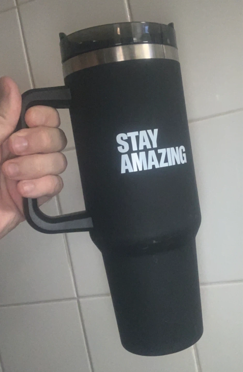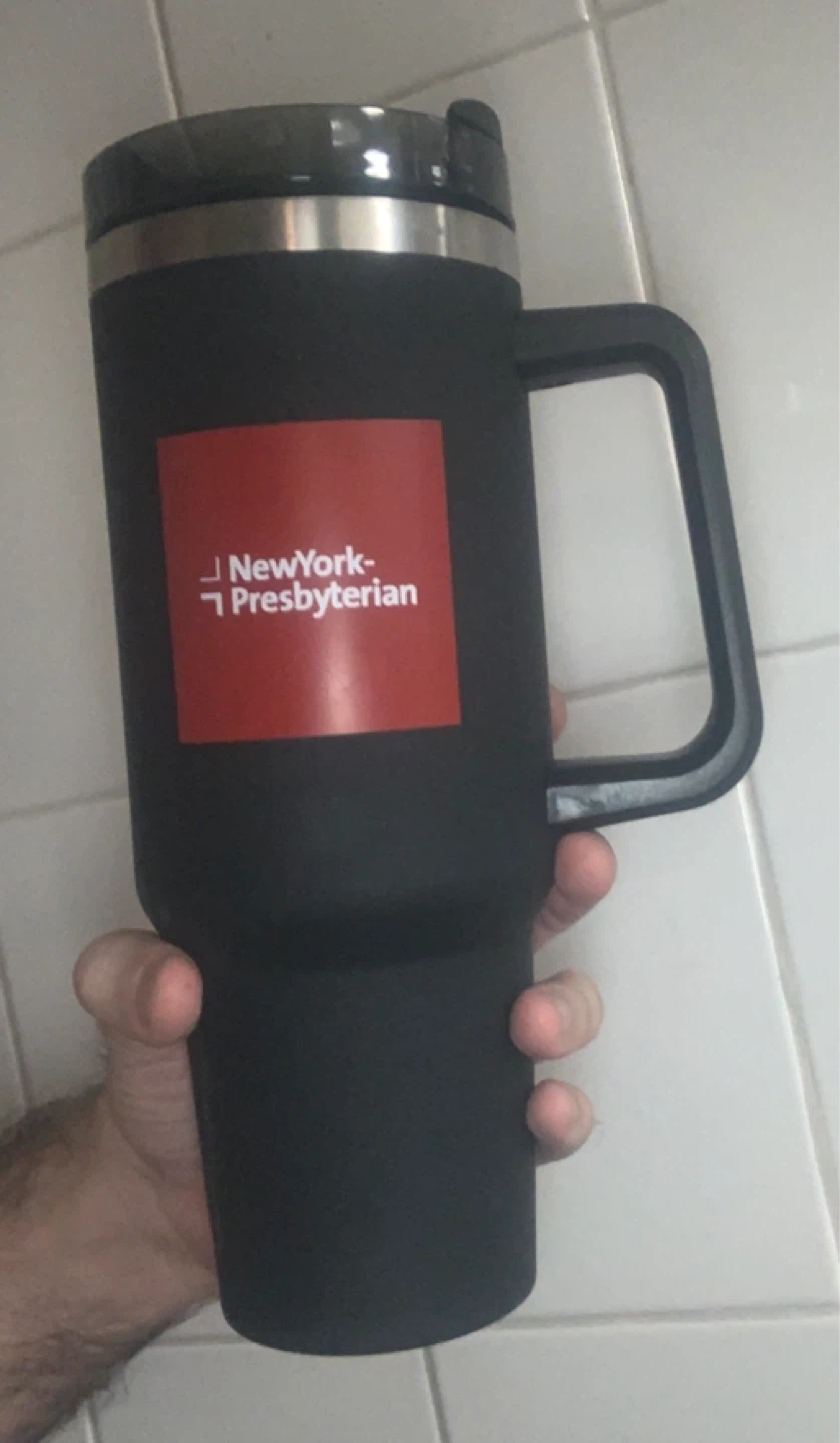 I have a black tumbler with the words "STAY AMAZING" printed on it. It also has the New York-Presbyterian logo. This tumbler is perfect for keeping your drinks hot or cold on the go! Stands 11 inches tall but it’s not too heavy. Pickup in Astoria Queens
