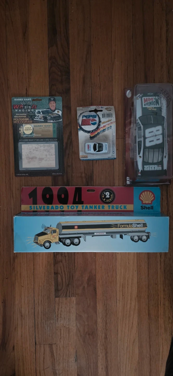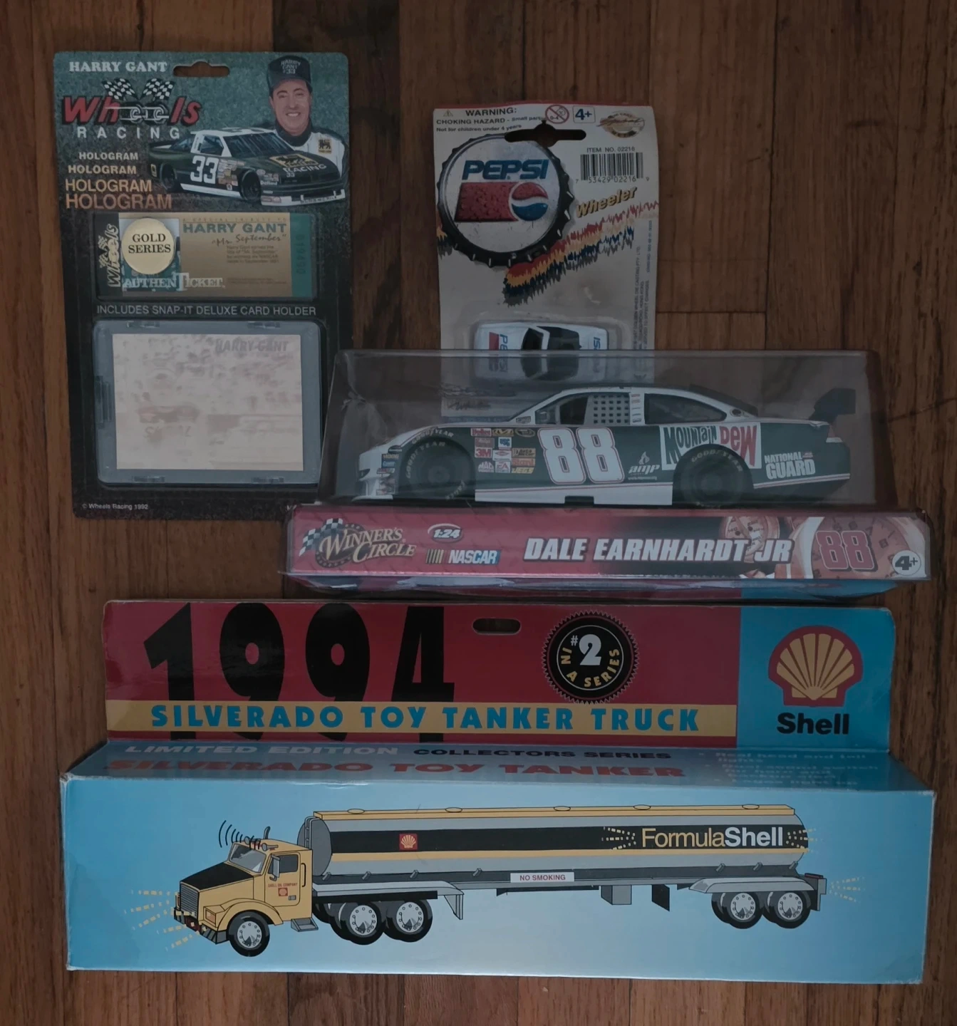 Selling a collection of vintage diecast race cars and a tanker truck. Includes: