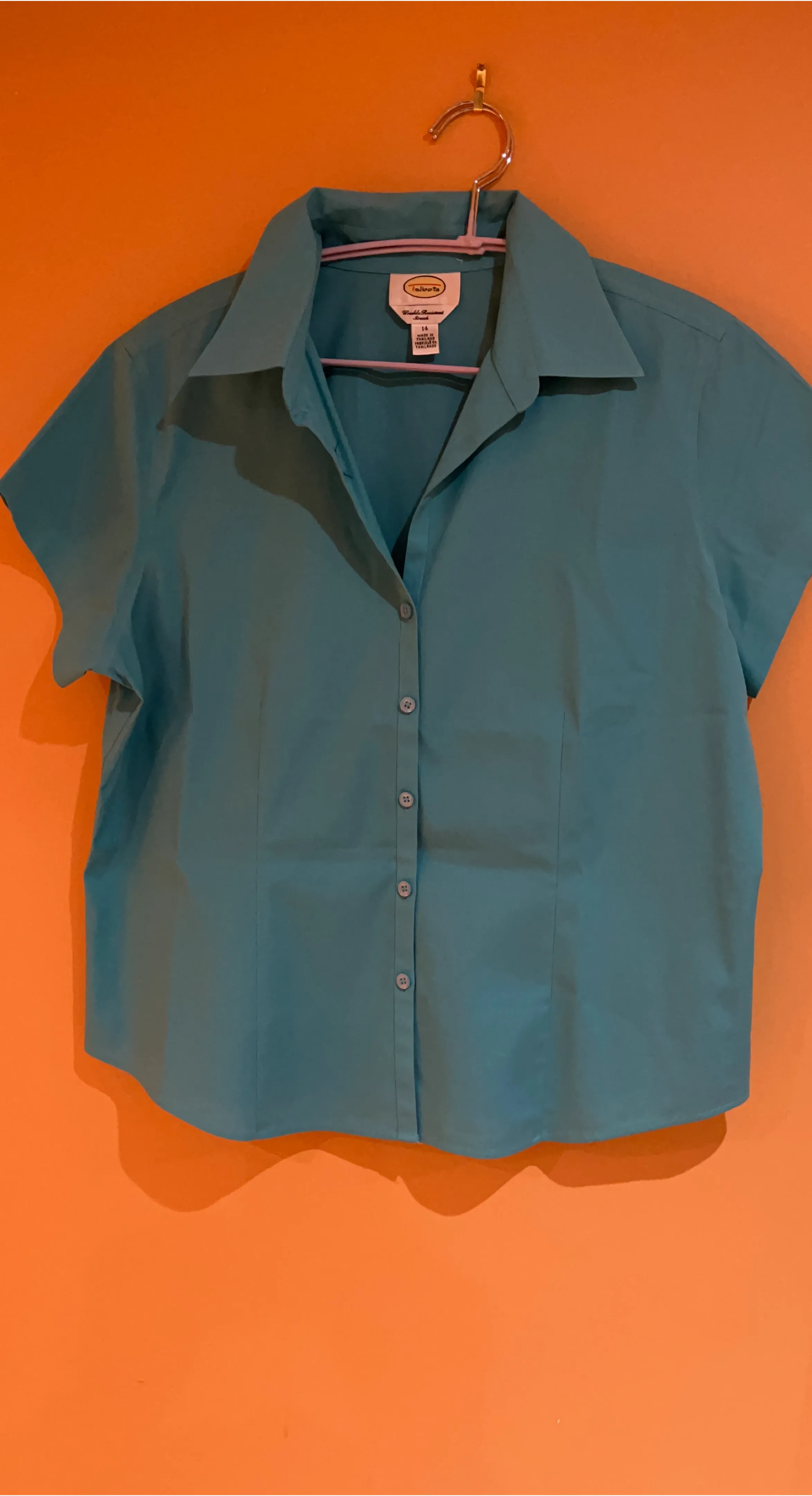 I'm selling a Talbots wrinkle-resistant short-sleeved button-down shirt in size 14. It's a lovely teal colour and made in Thailand. Perfect for a casual or work outfit!