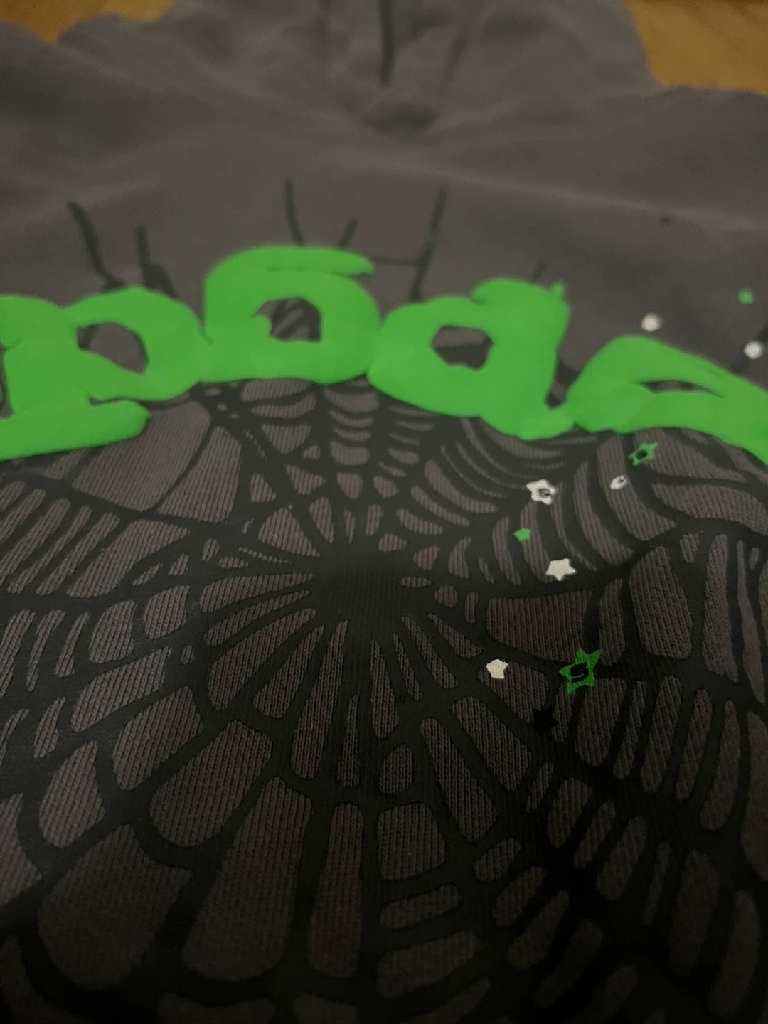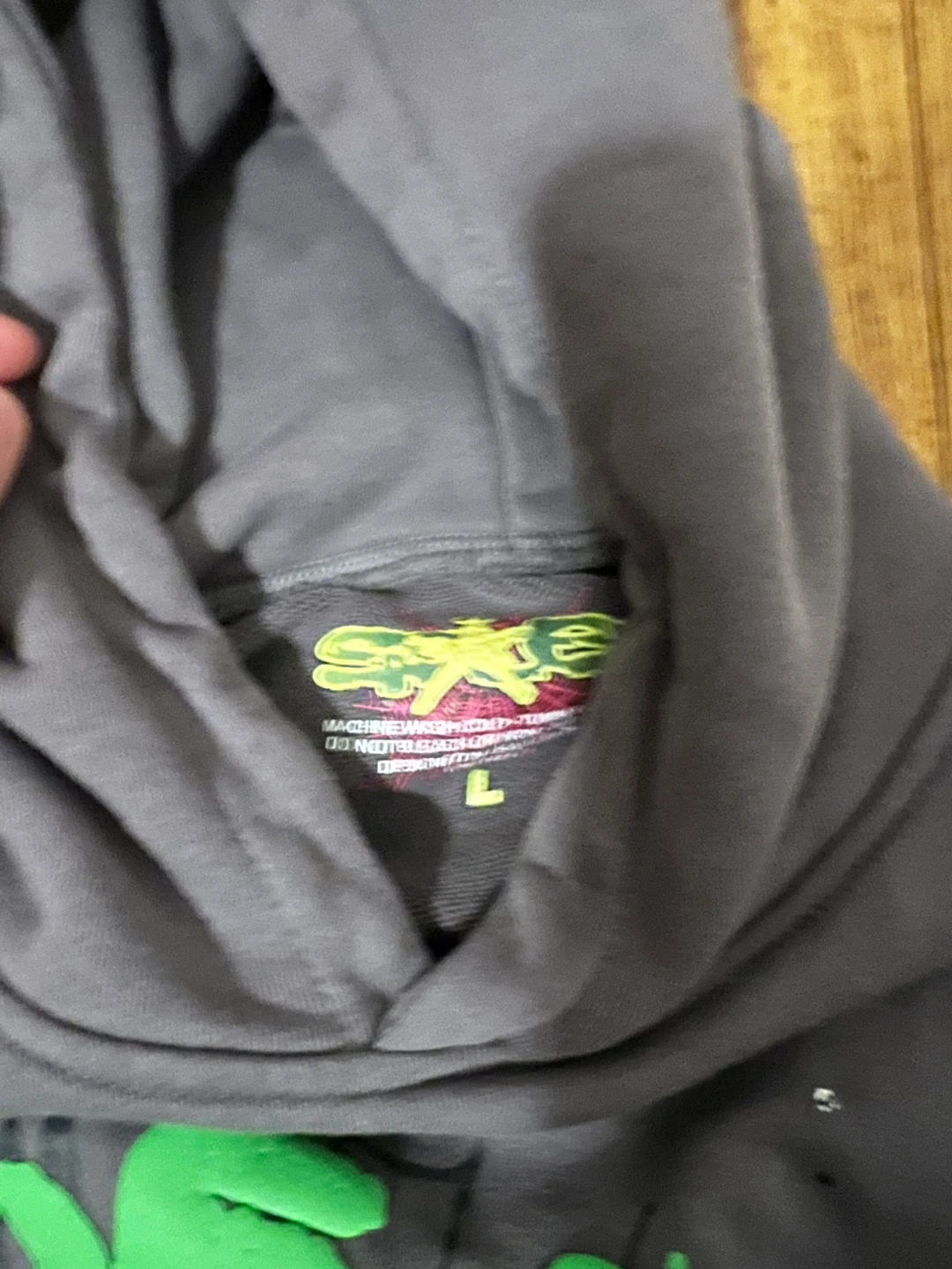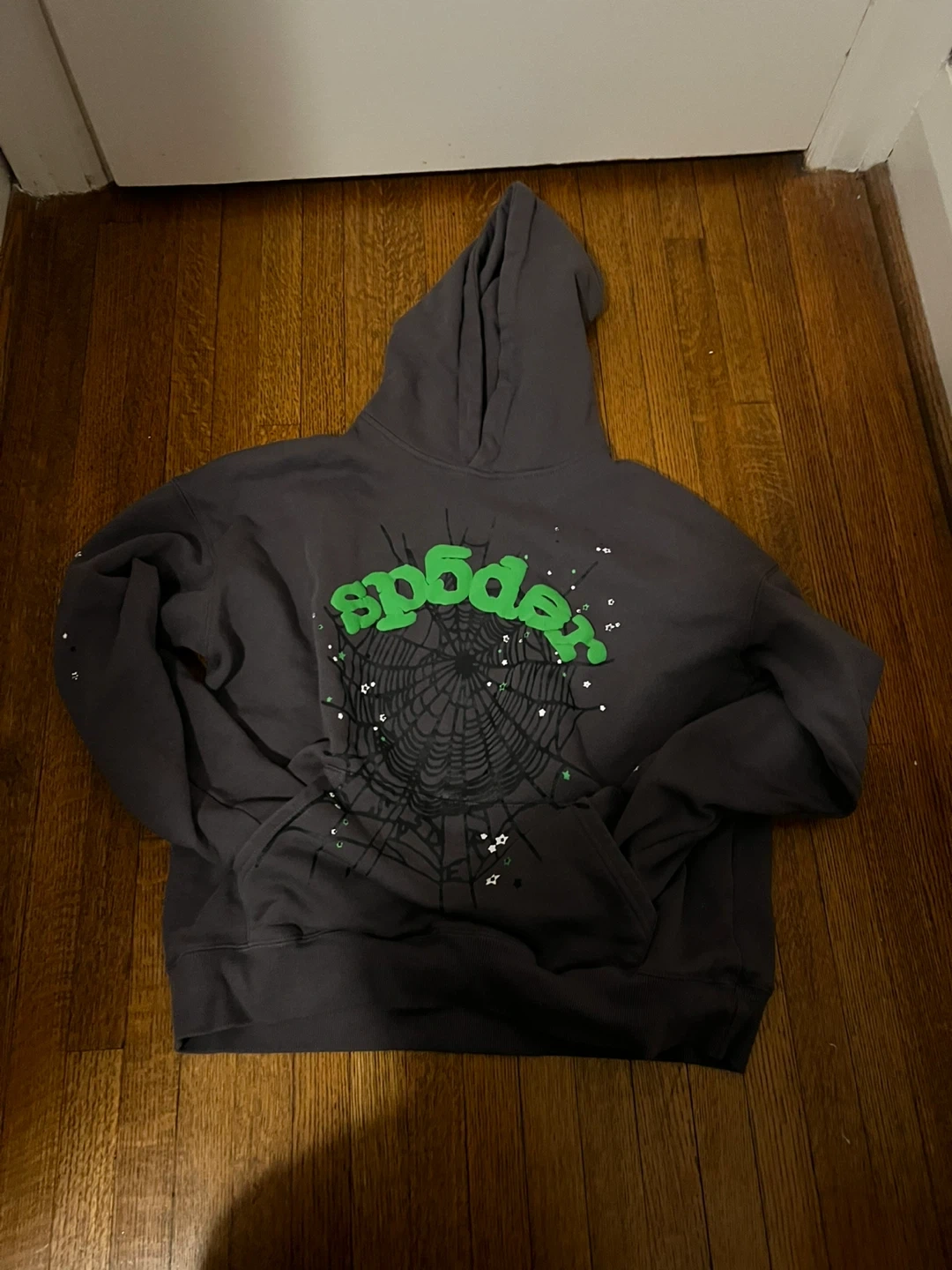 Selling a Spoder hoodie in size L. It features a spiderweb design with green lettering. A cozy and stylish addition to any wardrobe!