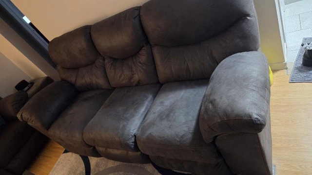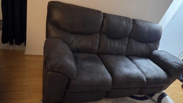This is a comfortable reclining sofa, perfect for any living room. It's in used condition, and could be perfect for any household looking for affordable seating. I'm looking to sell this couch for a great price! Bought for $1800, but selling for $399 as it's a moving sale. If the ad's still up, it's still available!
