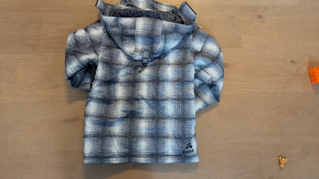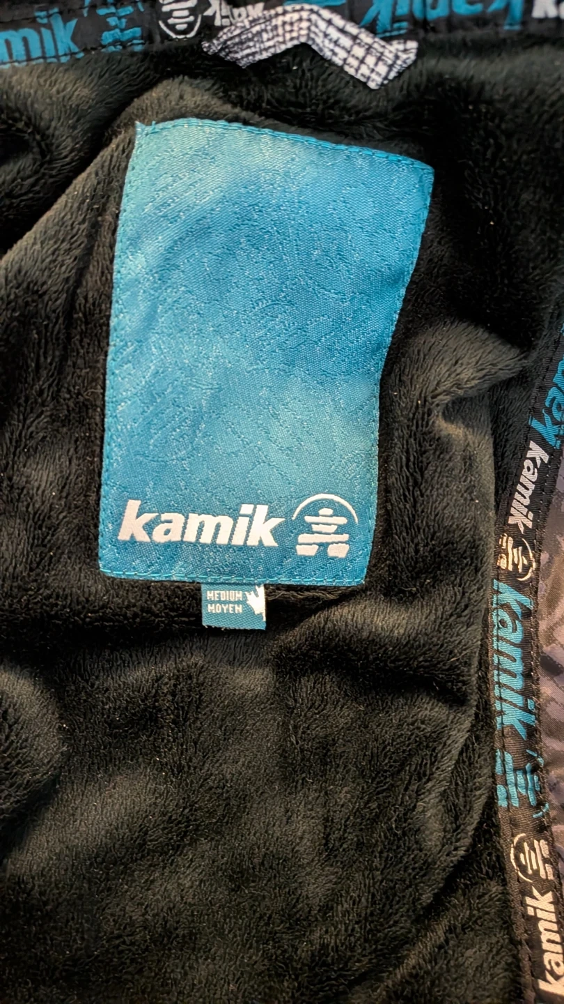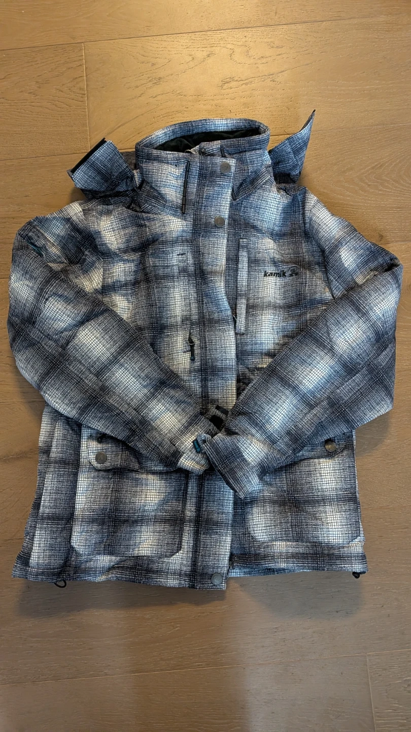 Selling a Kamik women's winter jacket in a stylish blue and white plaid pattern. It's a size medium and has a cozy, warm lining. Perfect for staying warm during the Canadian winter!