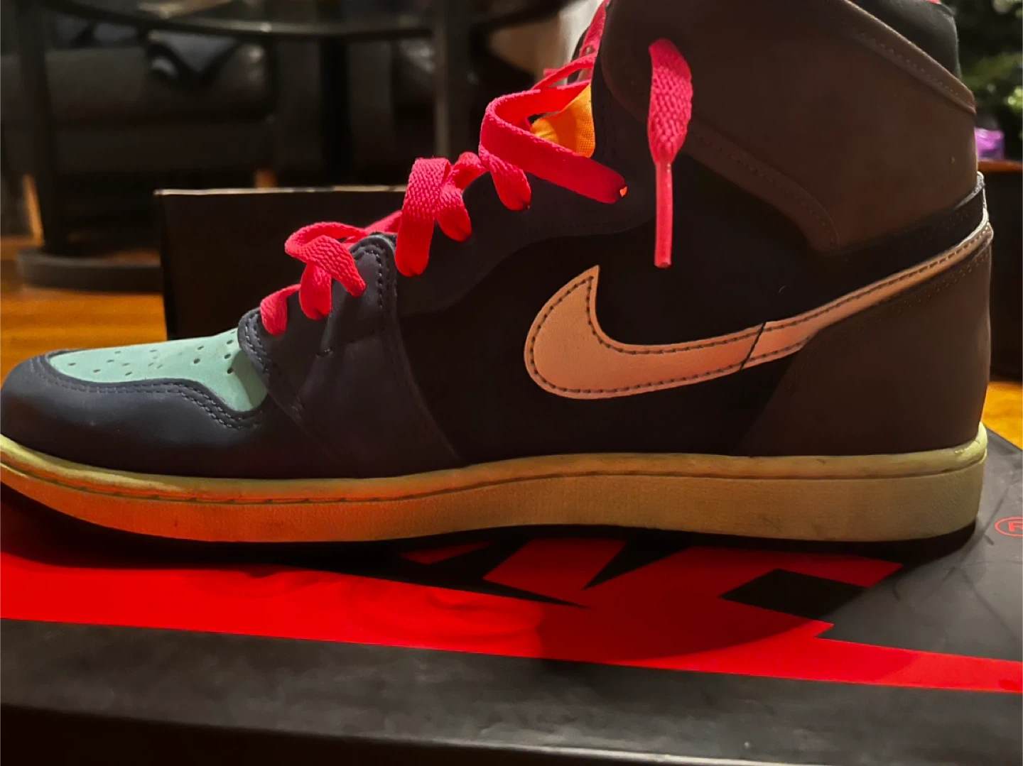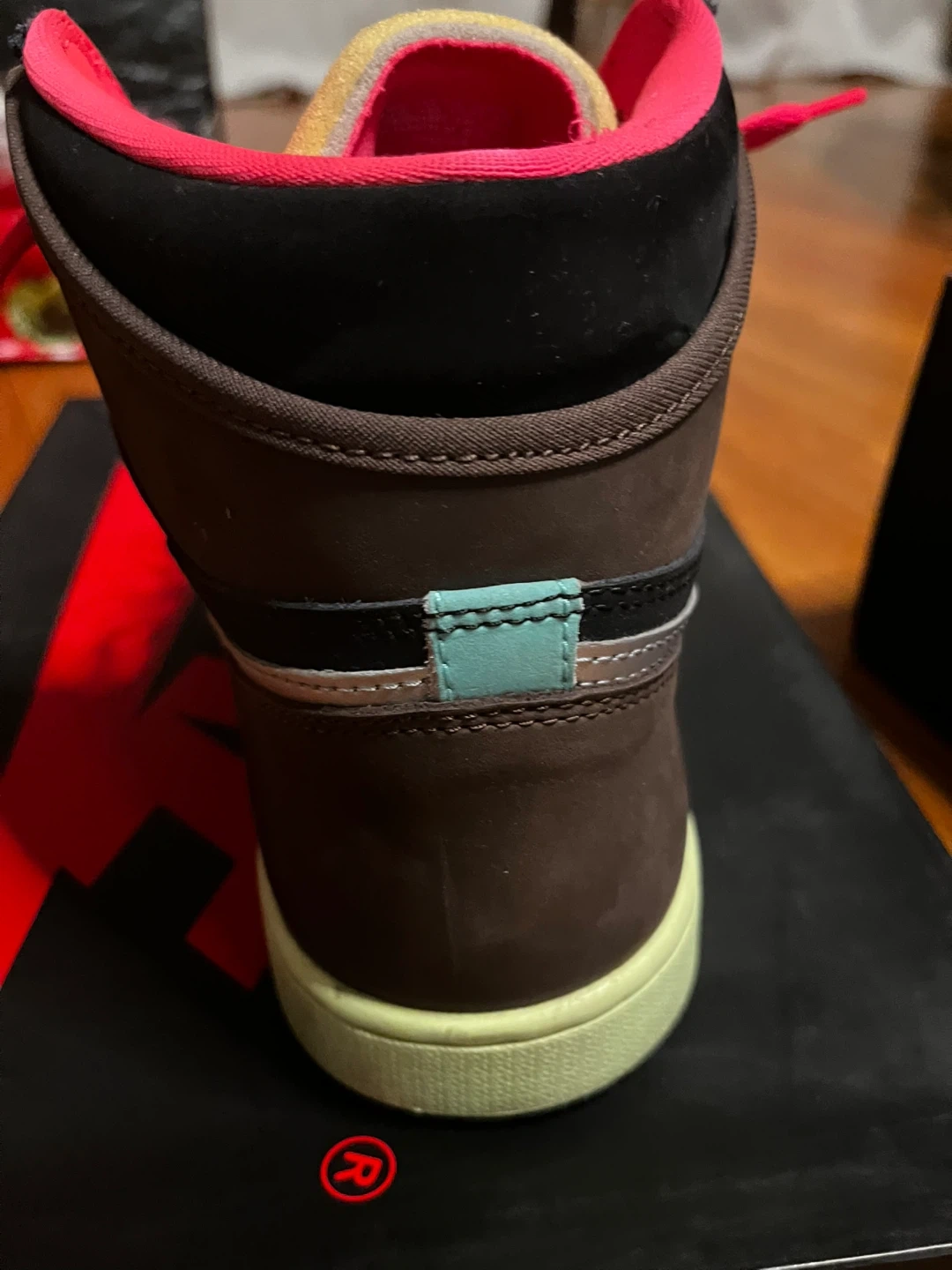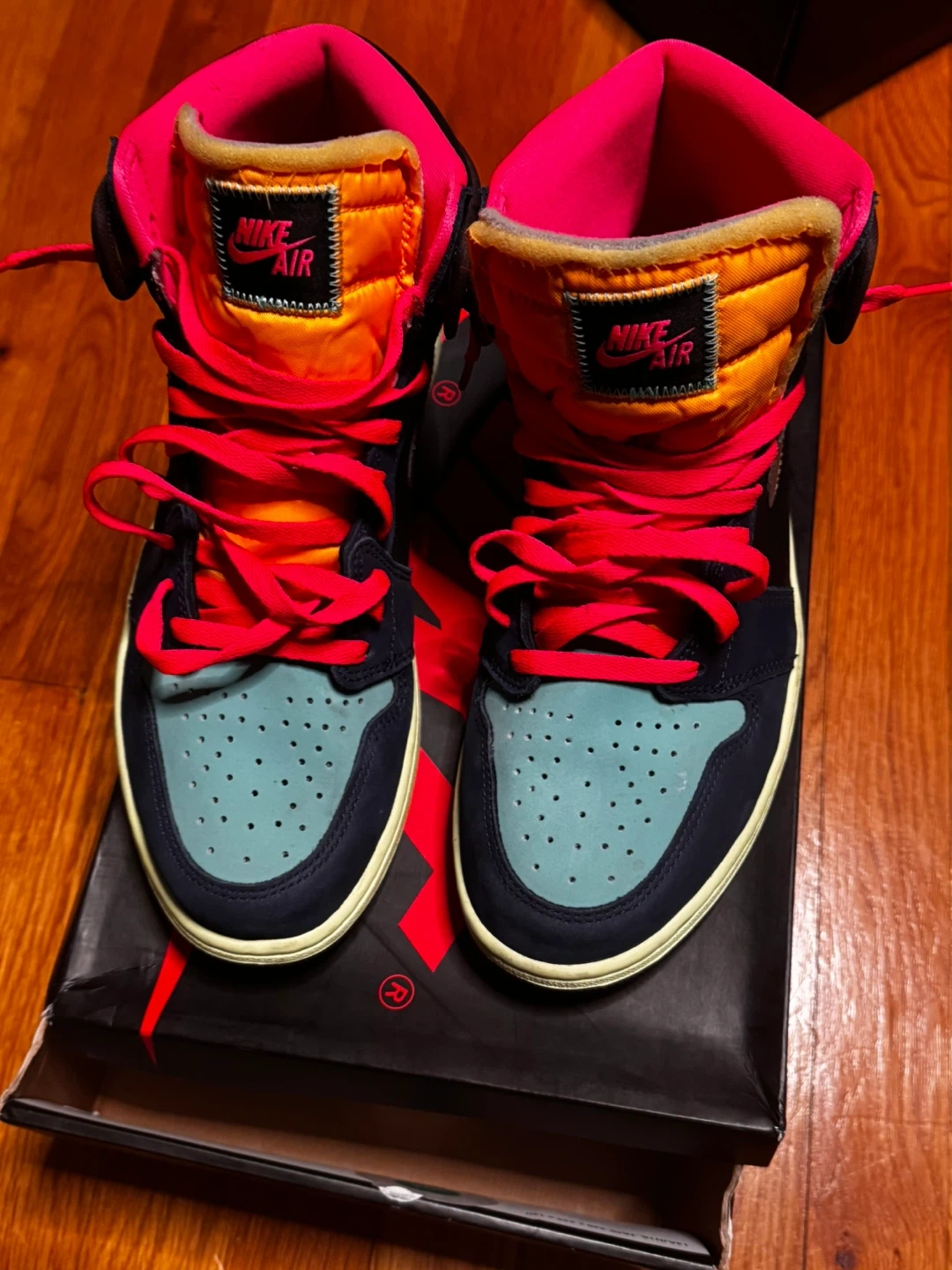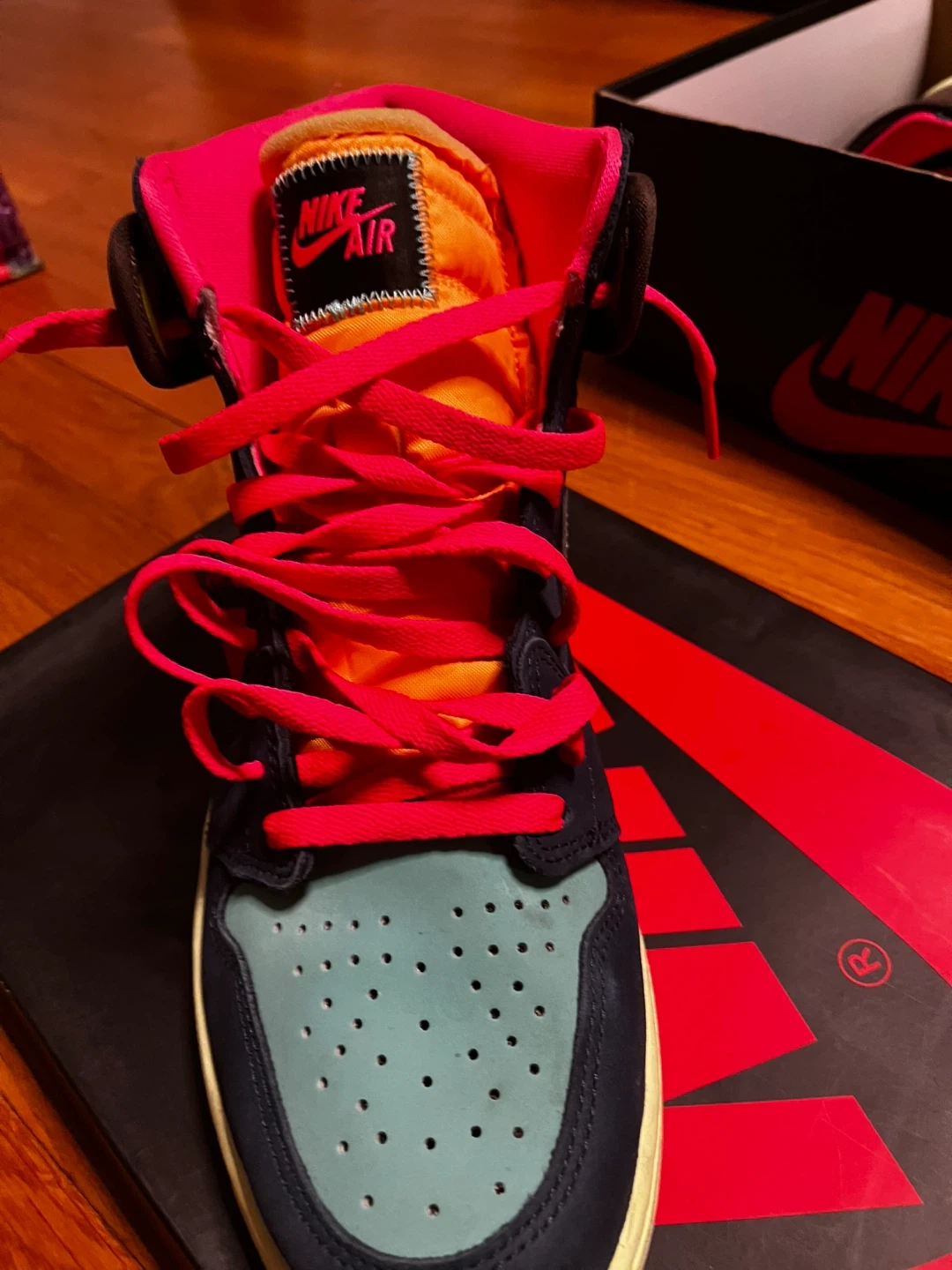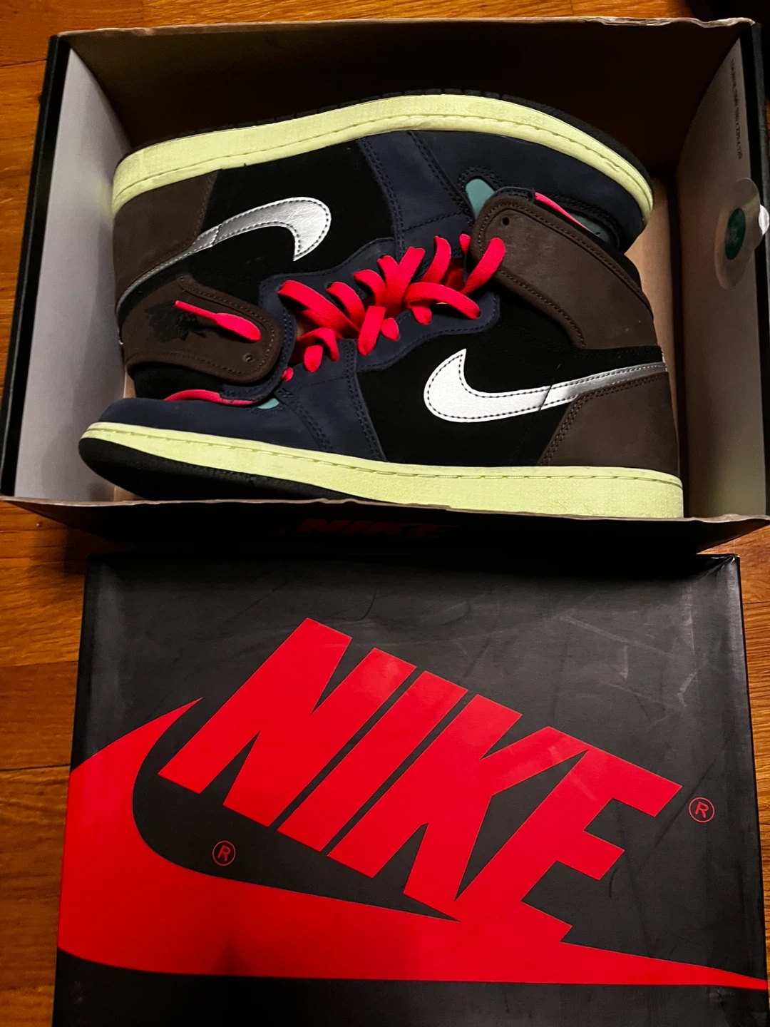 Selling a pair of Nike Air Jordan 1 Retro High Tokyo bio hack" sneakers. They come with the original box. The shoes have a brown, navy, and teal color scheme with pink laces. They are brand new.
