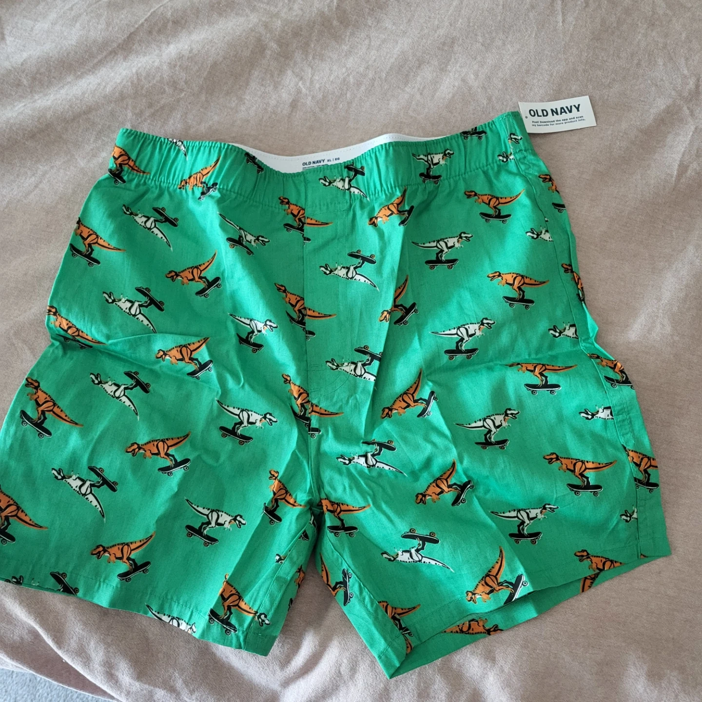 These Old Navy boxer shorts are brand new with tags! They feature a fun dinosaur and skateboard pattern on a green background. Size is XL for boys.