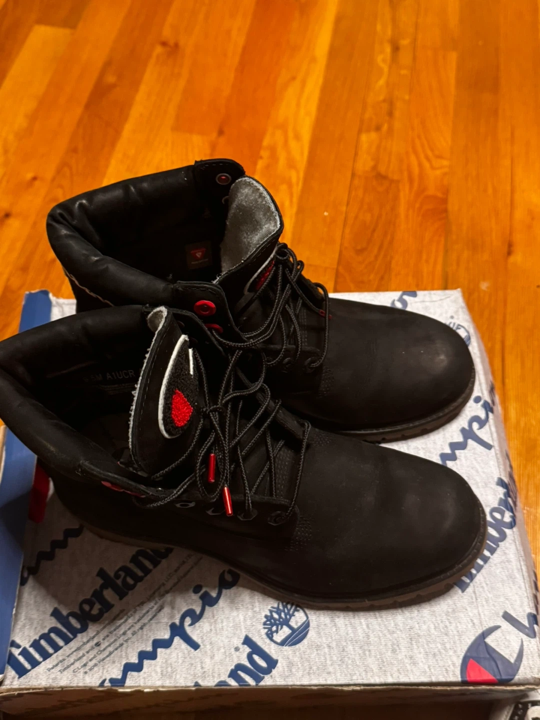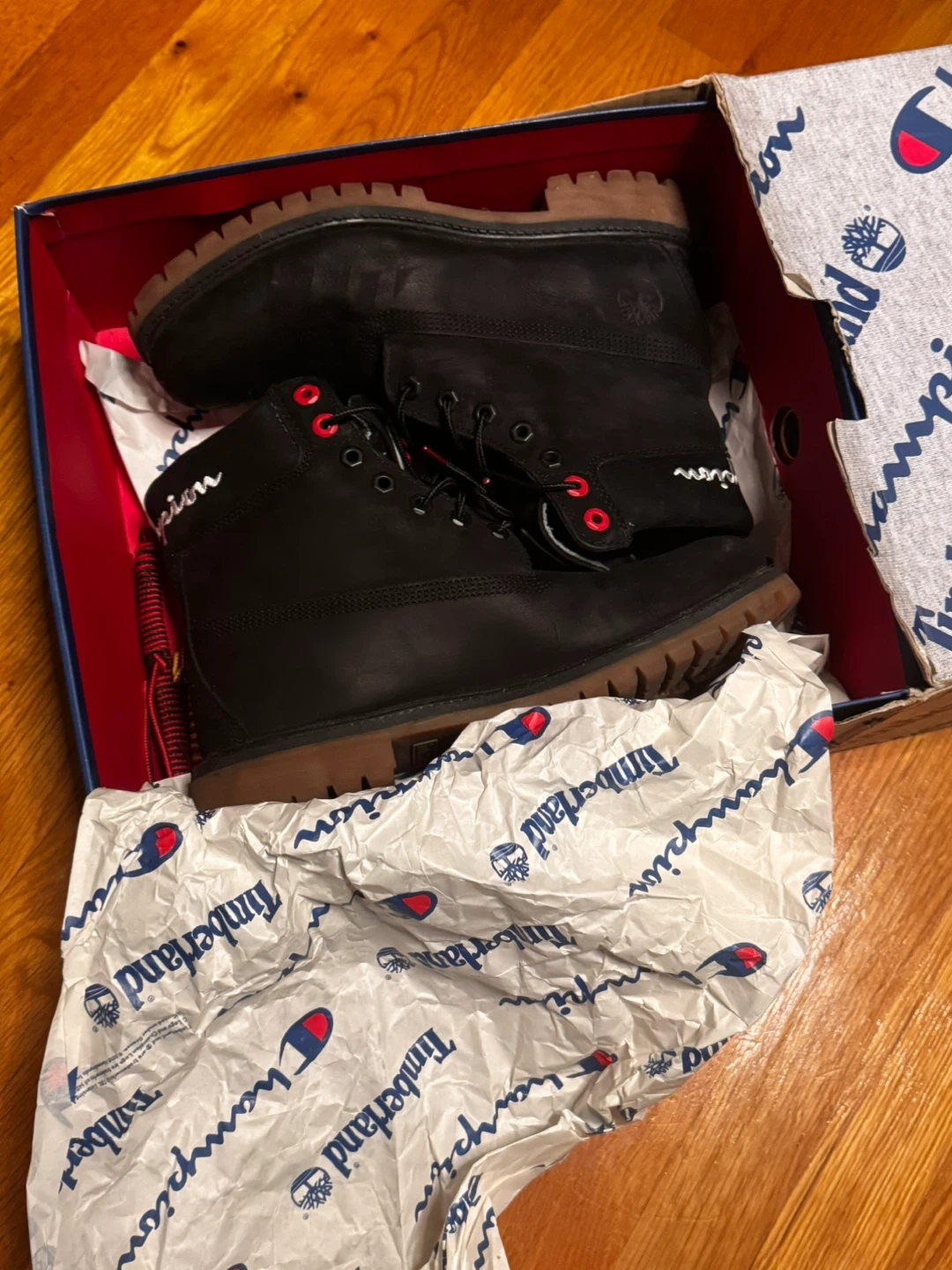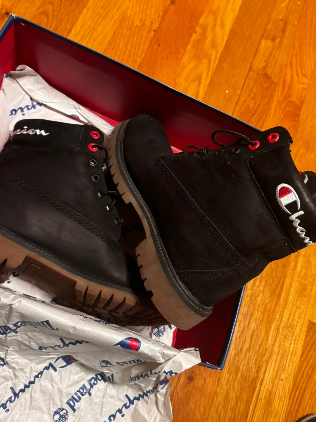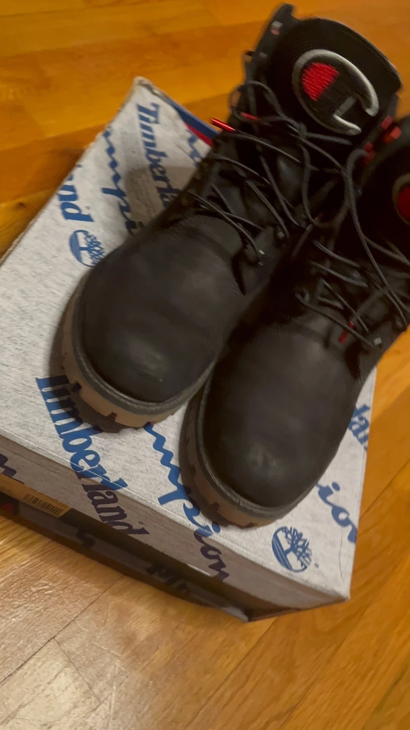 Selling a pair of Timberland boots in collaboration with Champion! These are black and come with the original box. They're in great condition, ready for a new owner