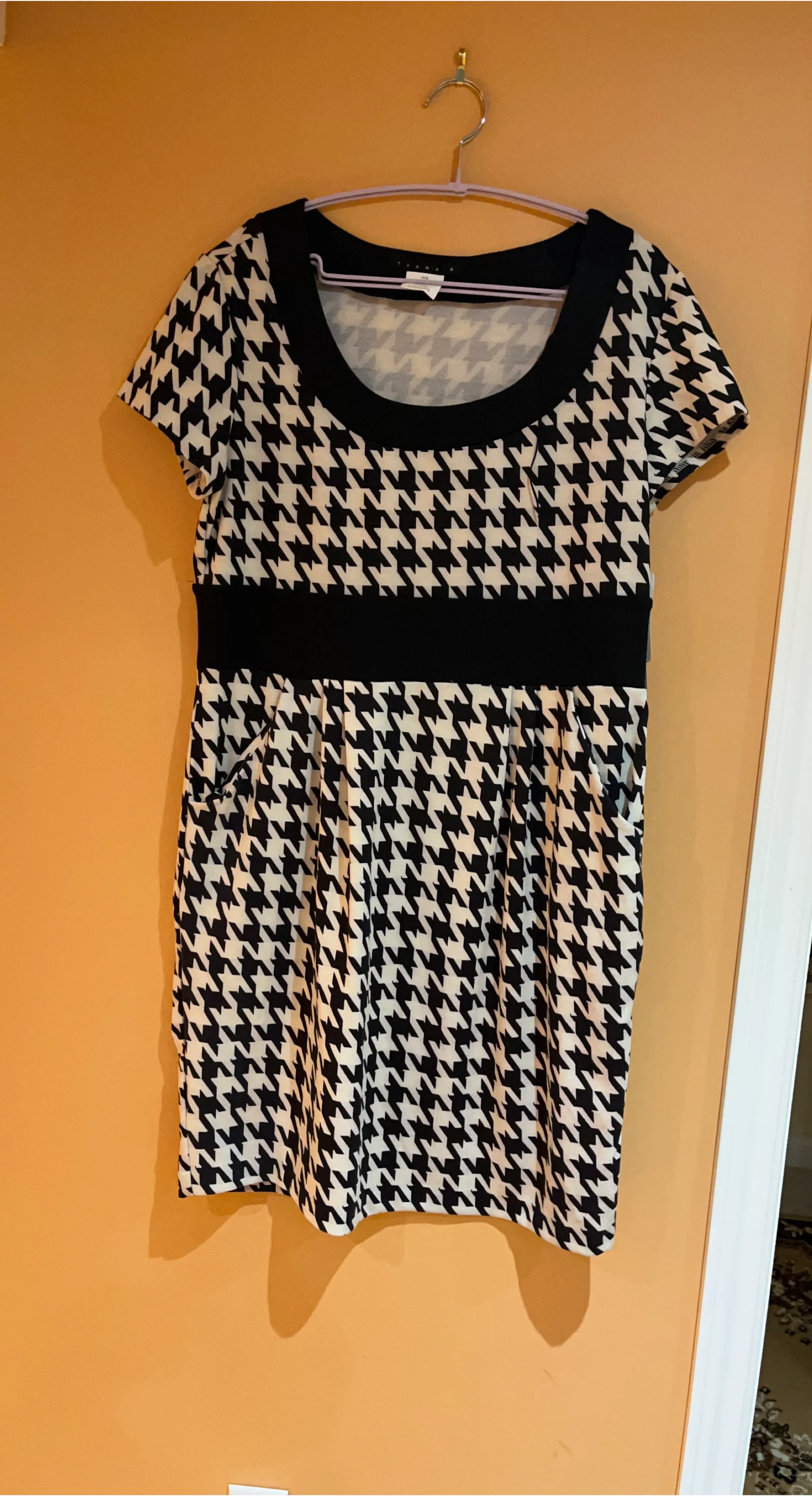 A cute Tiana B dress with a houndstooth pattern! It features a black waistband and a classic round neckline. Perfect for adding a touch of vintage charm to your wardrobe. Brand new with tags