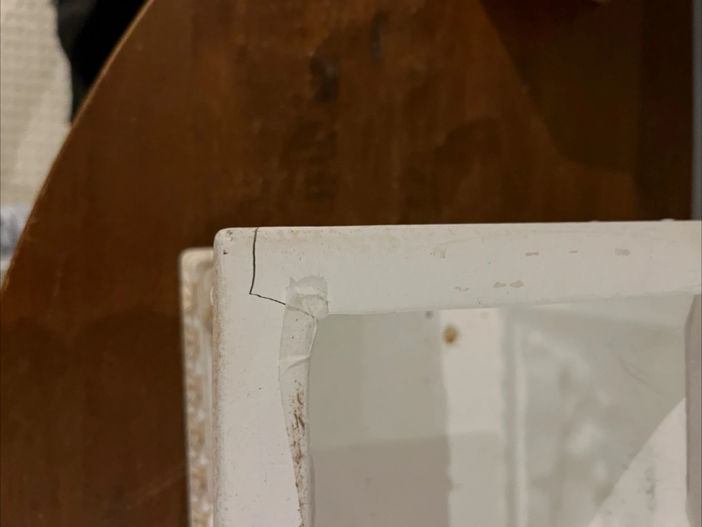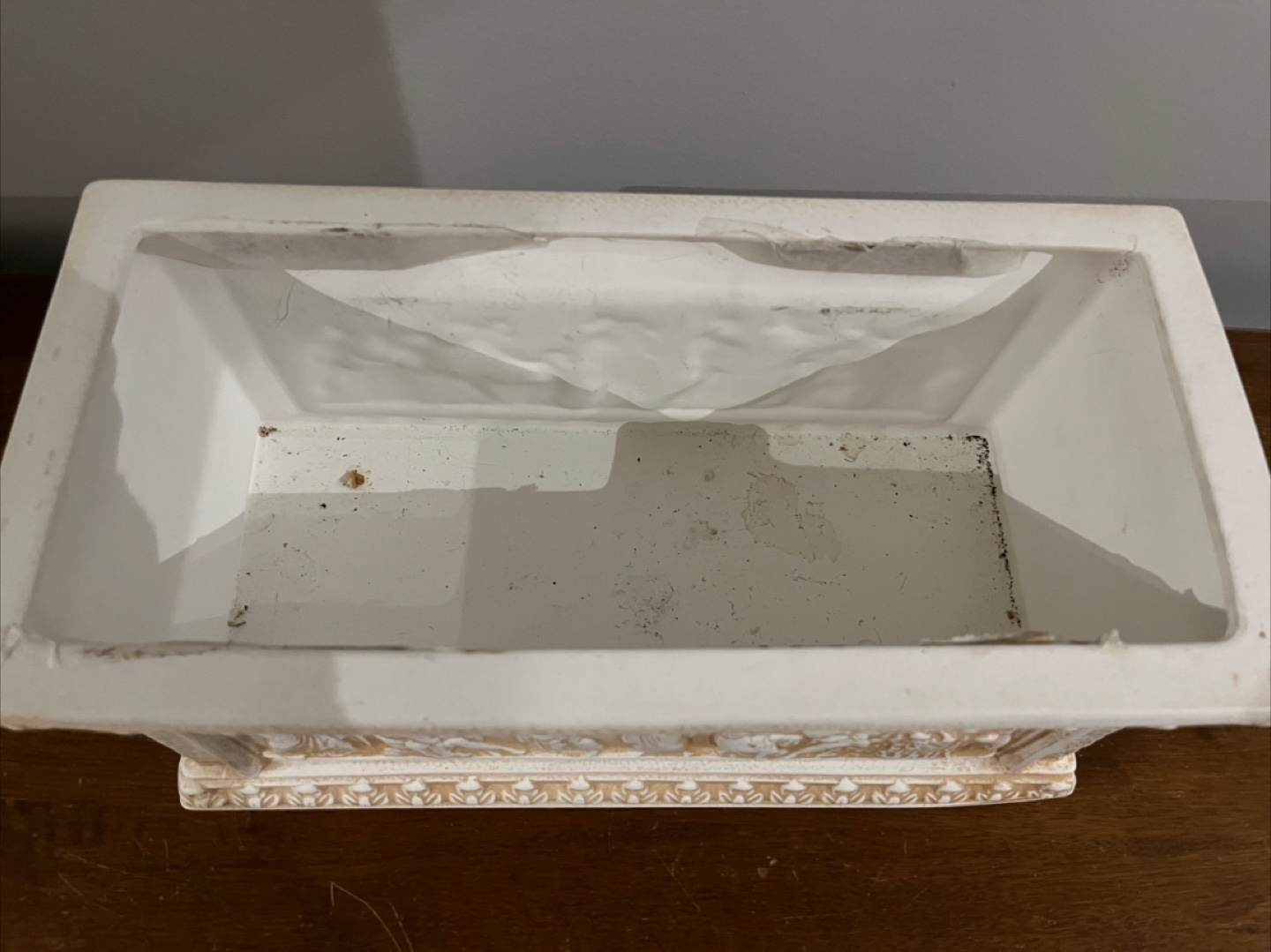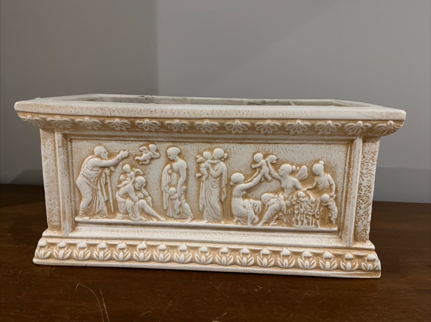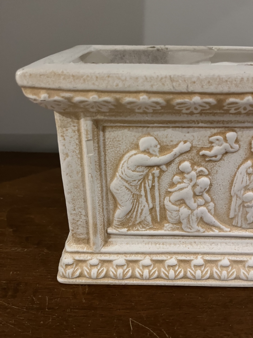 Decirative planter box with a Roman-style design. It's a creamy off-white colour and measures approximately 11 inches long and 6 inches wide. It does have a minor crack on 1 corner as shown in the photos. Price reflects that.