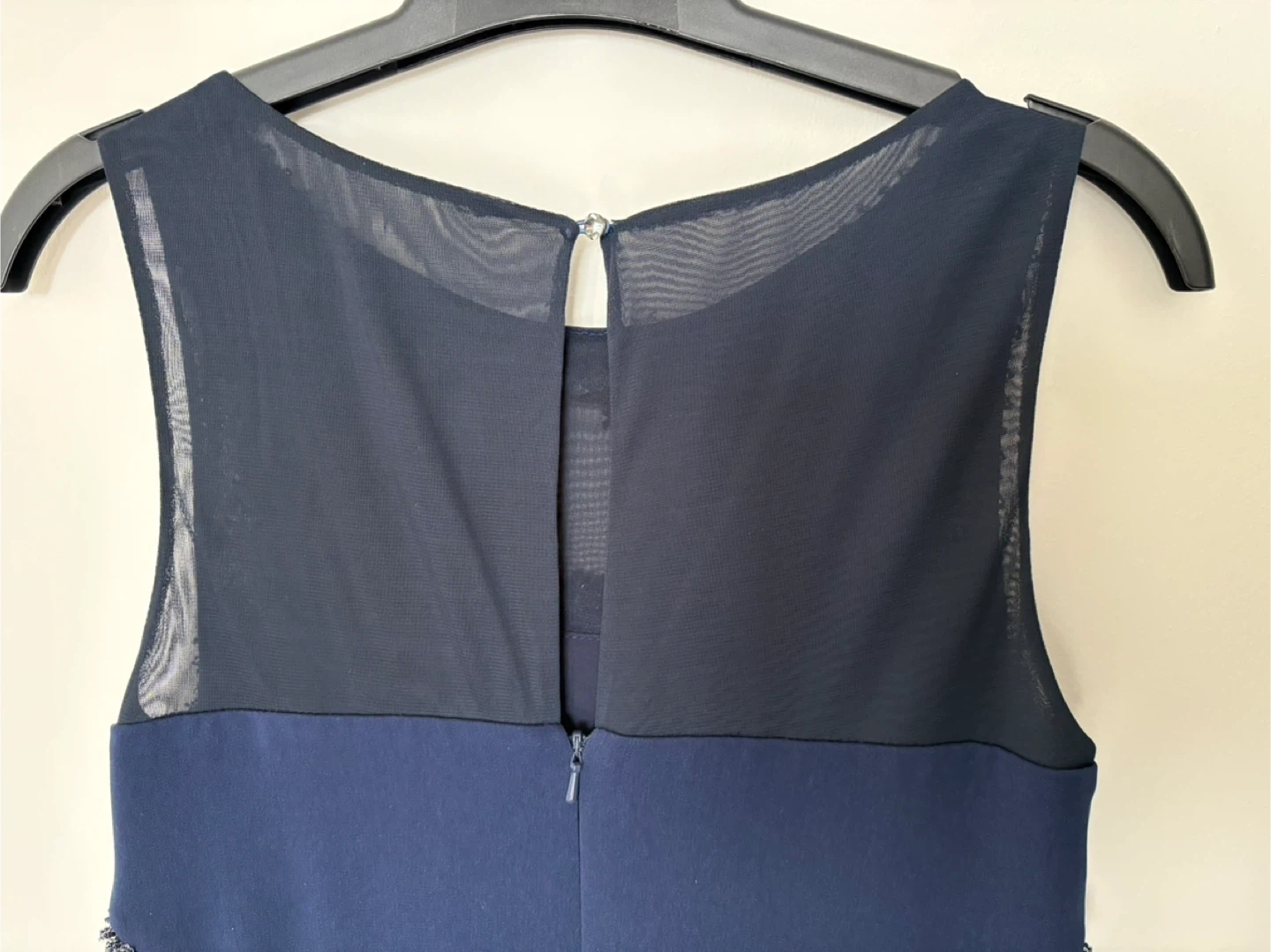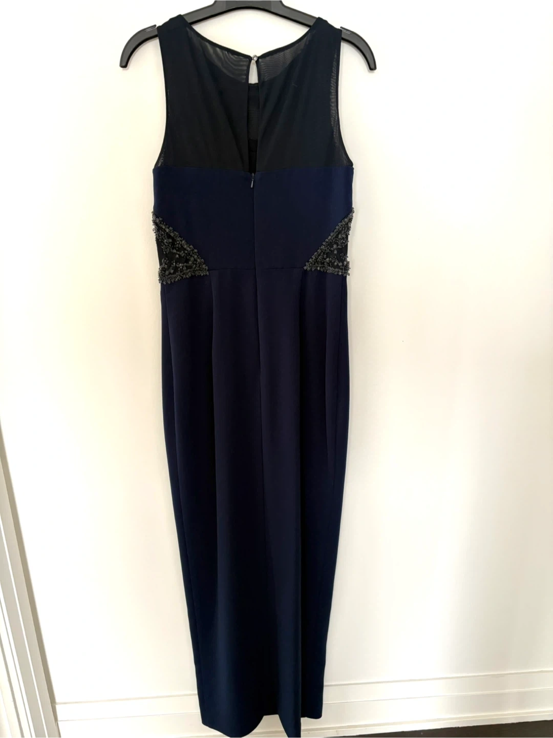 Stunning Badgley Mischka floor-length evening gown in a deep navy blue. This elegant, figure-skimming silhouette features intricate beadwork along the illusion neckline, bodice, and waist for a refined, sculpting effect. A subtle sheer upper panel adds sophistication, while the front center slit provides graceful movement and a touch of allure.