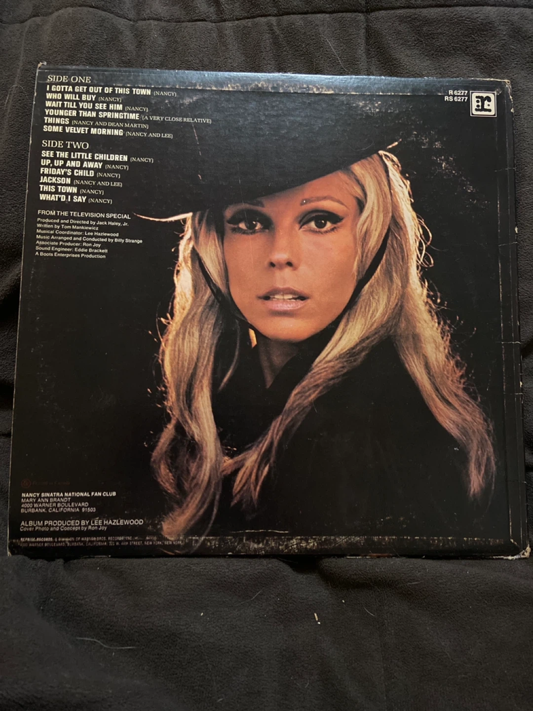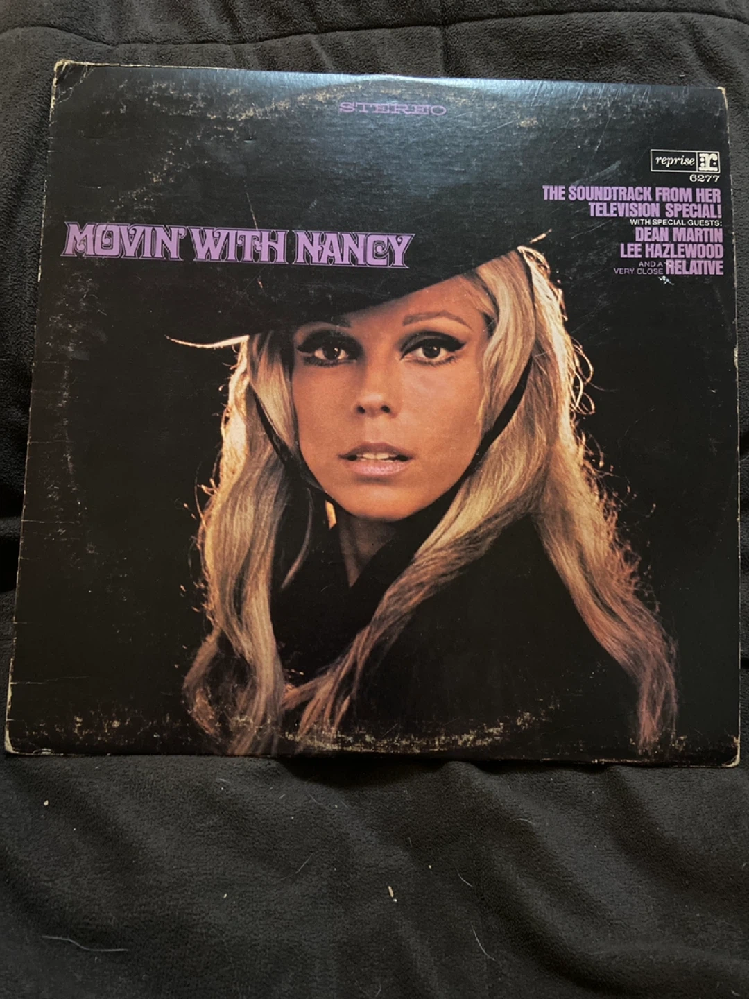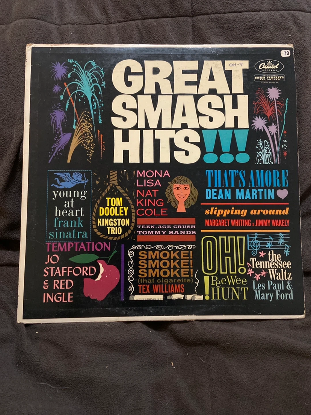 Selling a collection of vinyl records, including "Great Smash Hits!!!" featuring artists like Frank Sinatra, Dean Martin, Nat Cole, and Tommy Sands, and "Movin' With Nancy." Perfect for any vinyl collector!