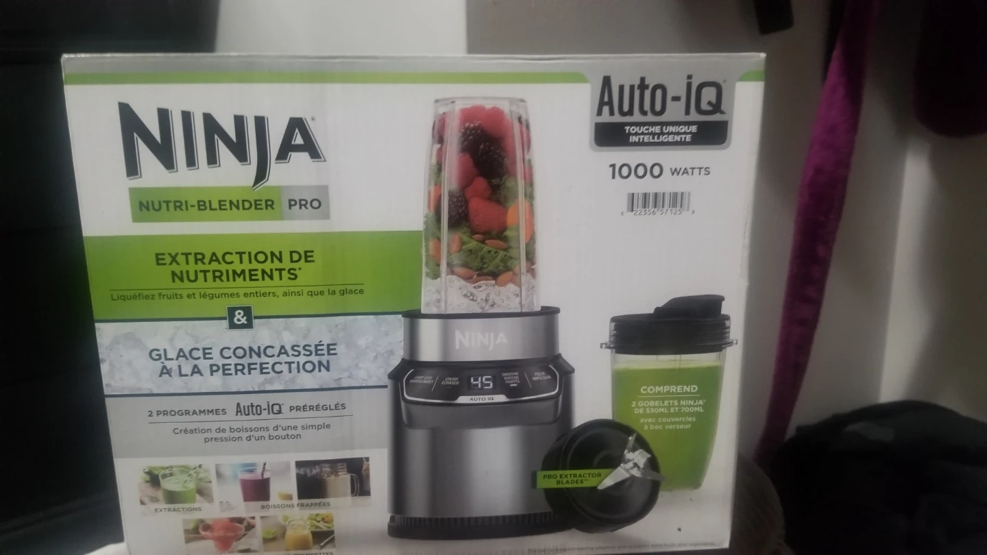Selling a Ninja Nutri-Blender Pro! This blender has Auto-iQ technology and a powerful 1000 watt motor. It can easily extract nutrients from fruits and vegetables, and even crush ice. It also includes two Ninja cups (530ml and 700ml) with spout lids, and pro extractor blades