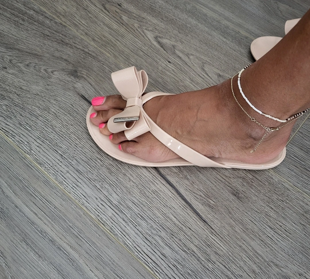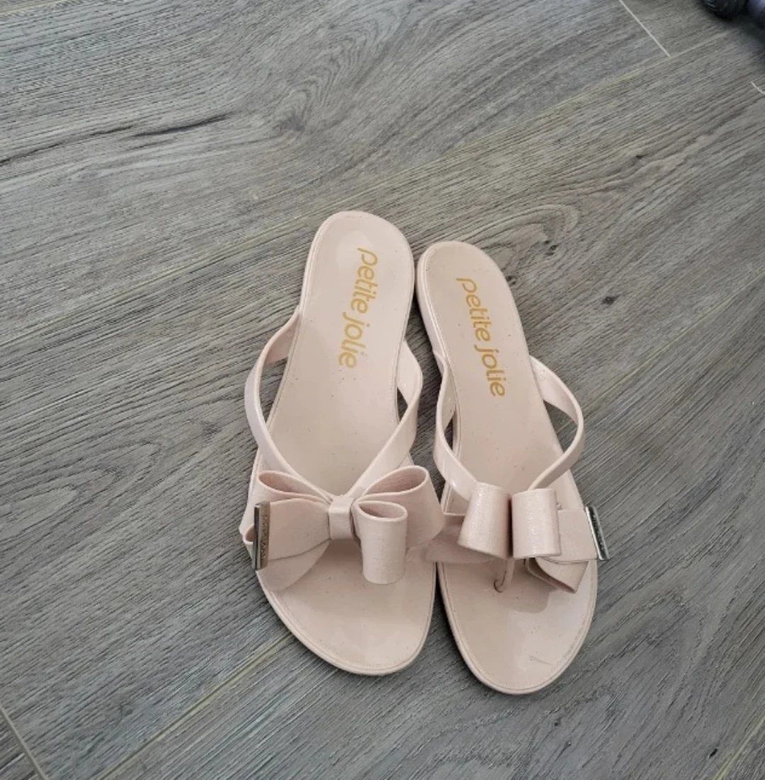 Cute Petite Jolie flip flops in a lovely pink colour, size 9.5. These sandals feature a stylish bow detail. Perfect for adding a touch of charm to your summer outfits!