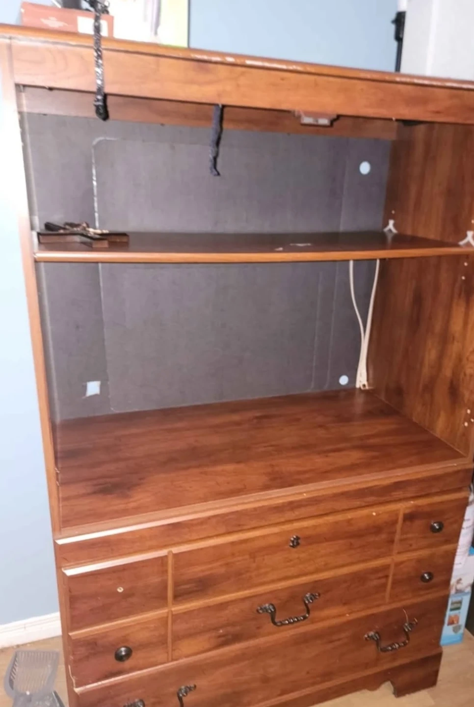 Here's a wooden hutch featuring drawers for extra storage. It's perfect for adding some classic style and functionality to any room in your home. It has a warm, inviting look!