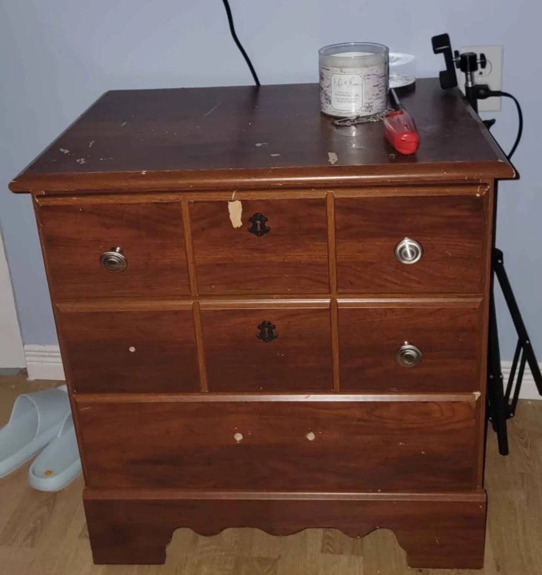 Selling a wooden nightstand with a brown finish. It has some visible wear and tear, as shown in the pictures, but it's still a sturdy and functional piece of furniture.