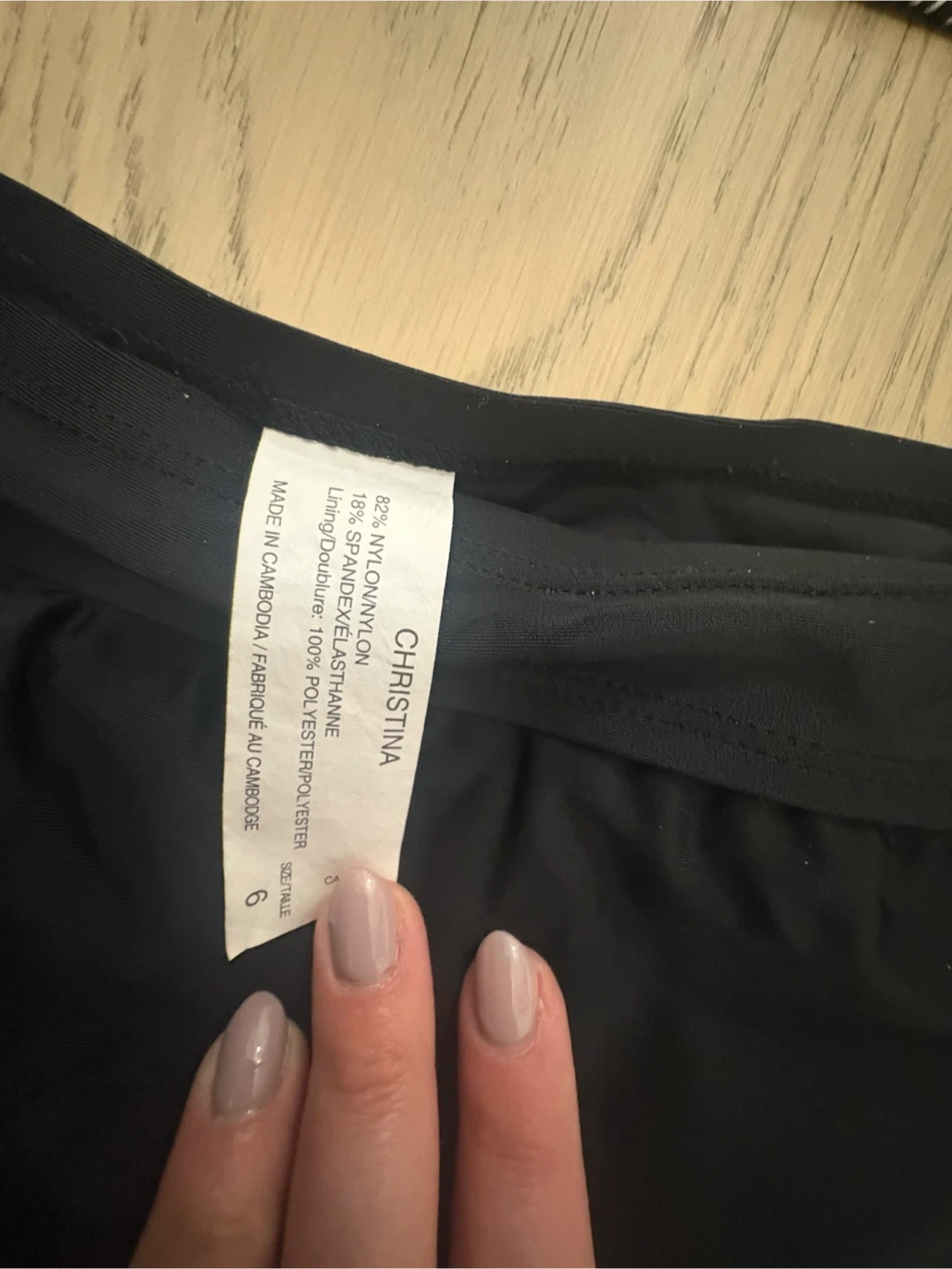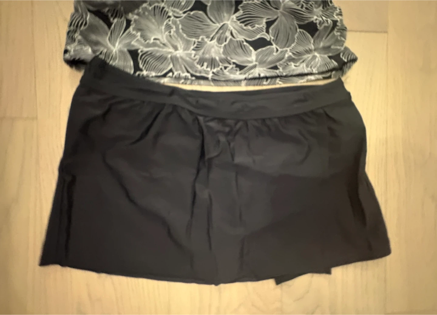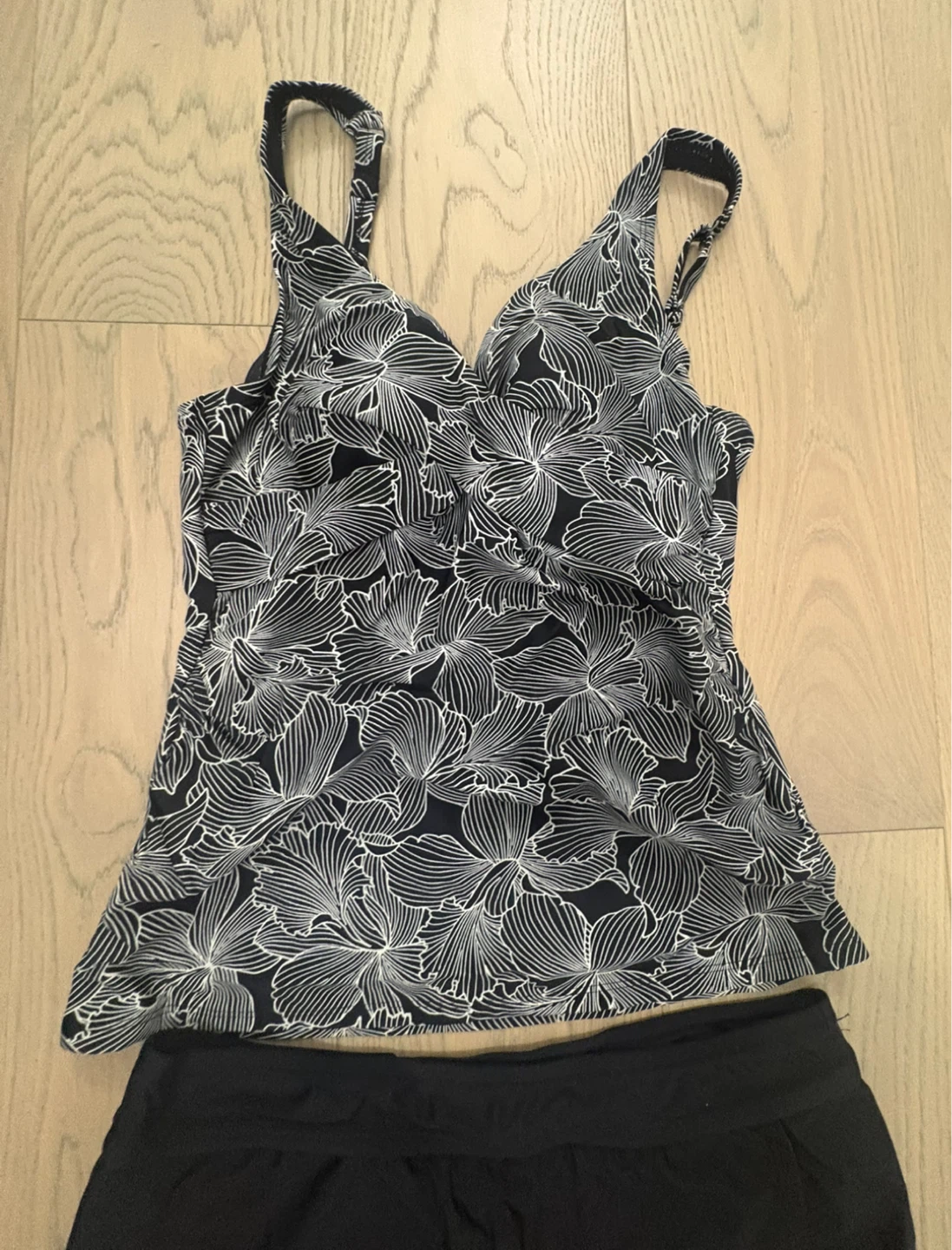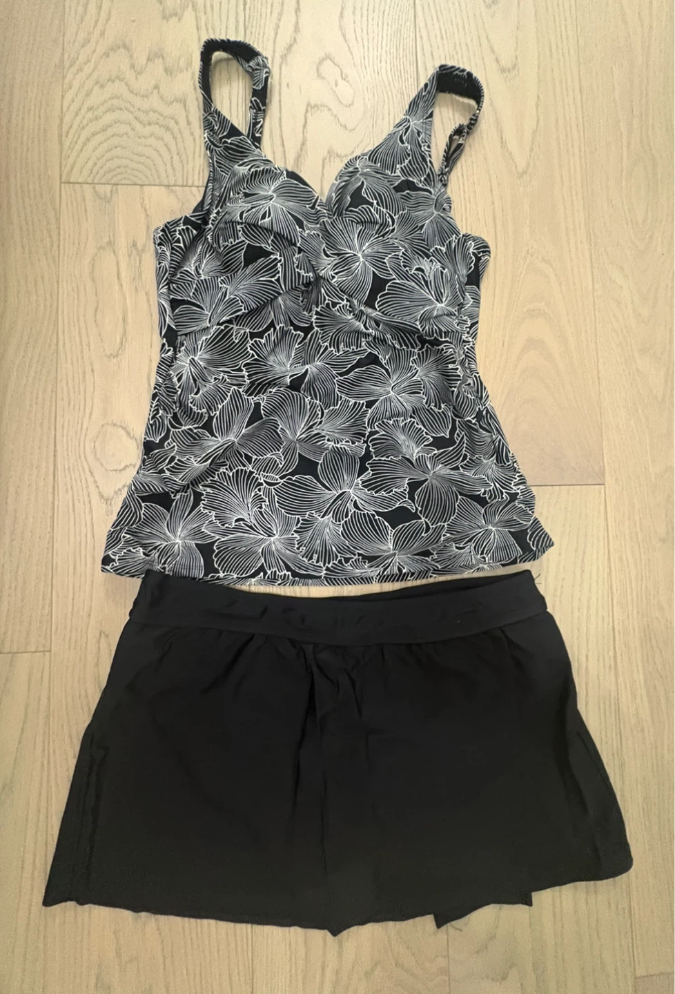 Selling a Christina brand tankini swimsuit set! The top is black and white with a floral pattern, and the bottom is a black swim skirt. The size is 6.