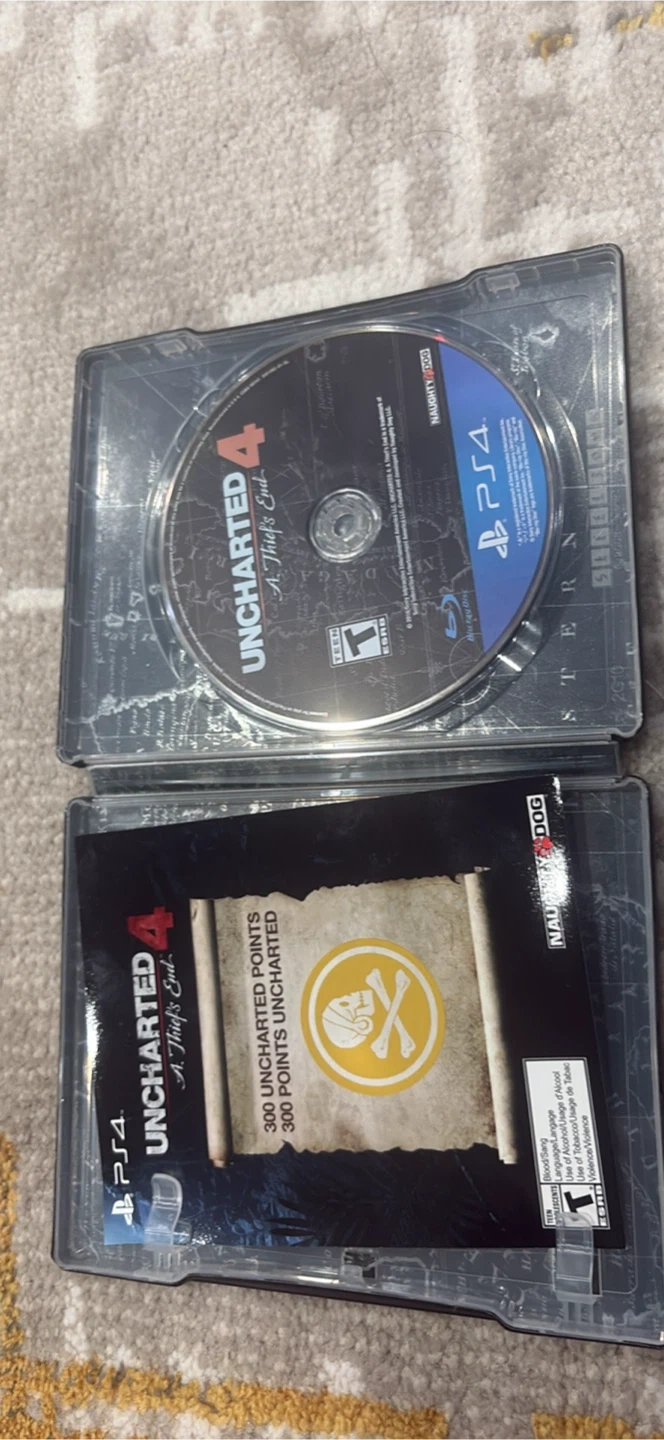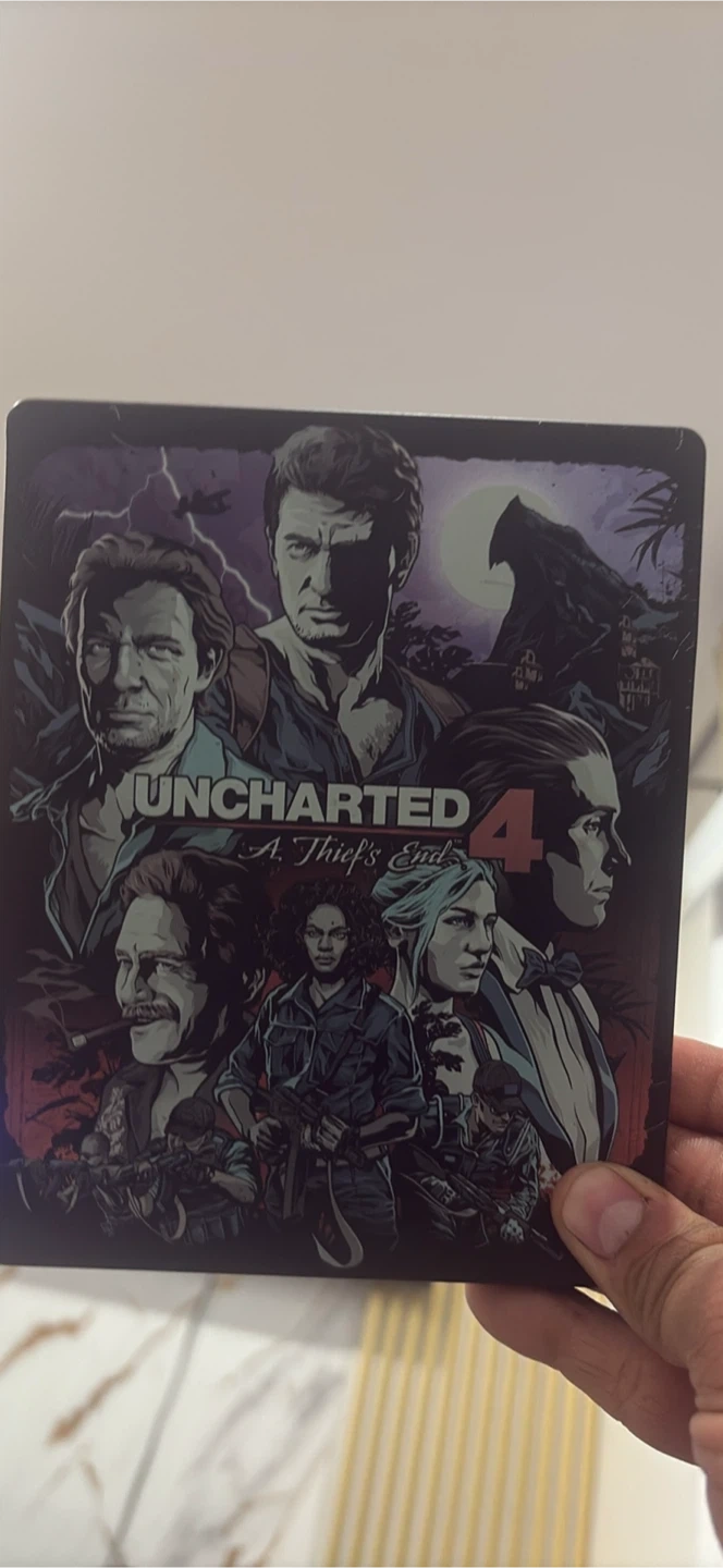 Selling Uncharted 4: A Thief's End for the PS4 in a cool steelbook case! Includes the game disc and a code for 300 Uncharted points.