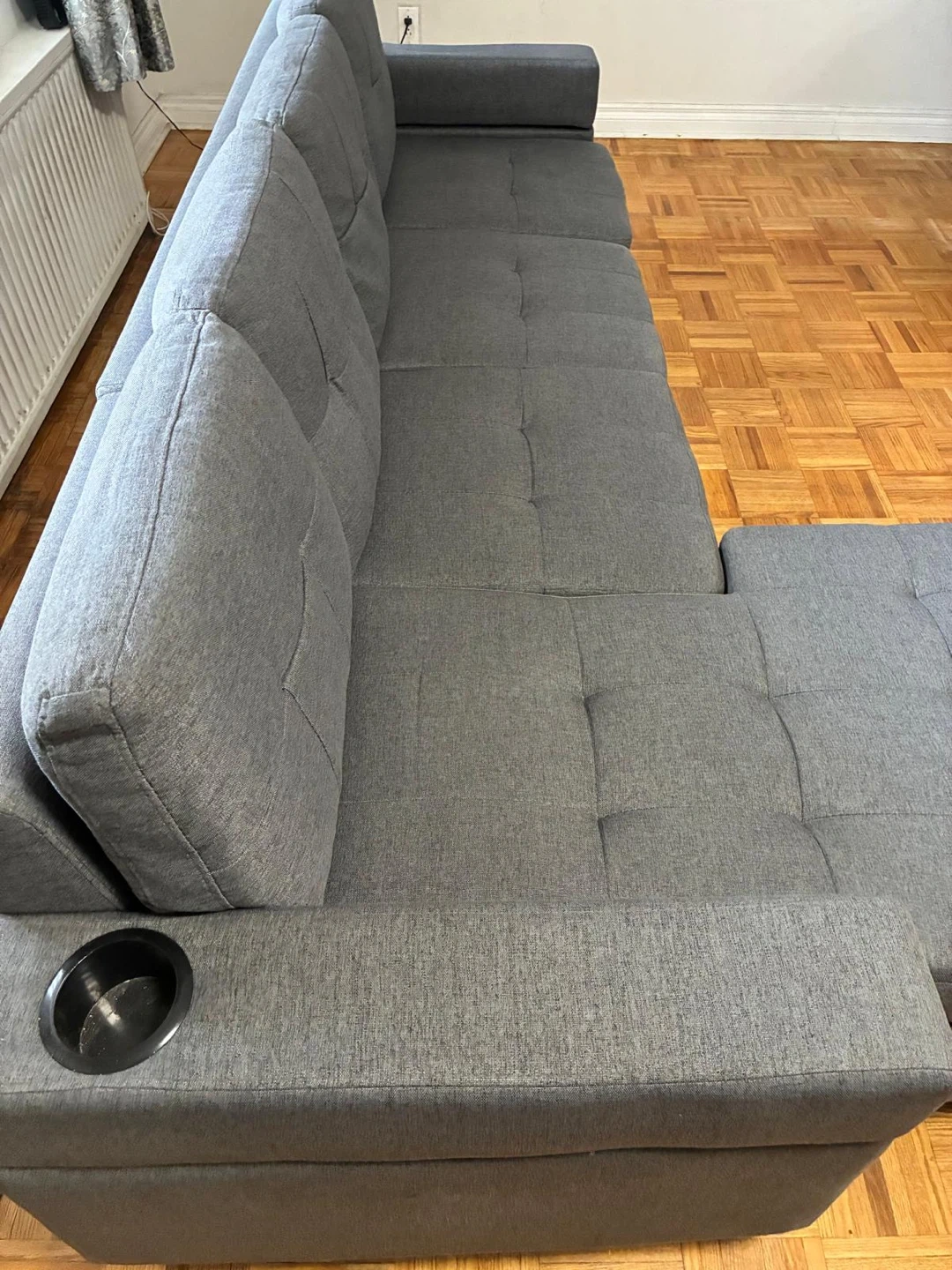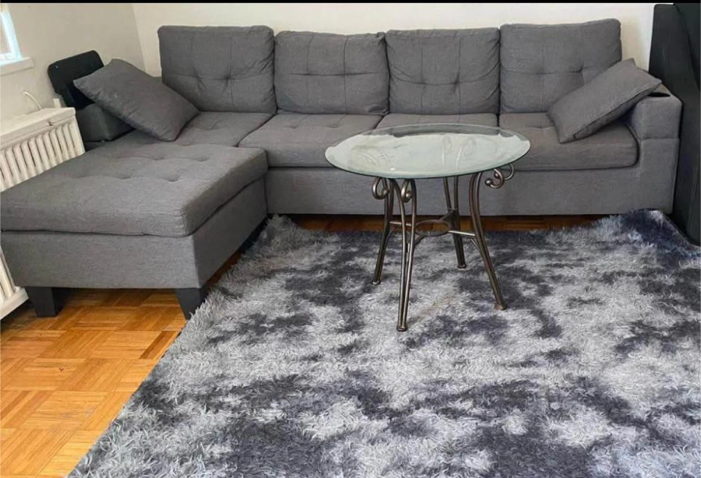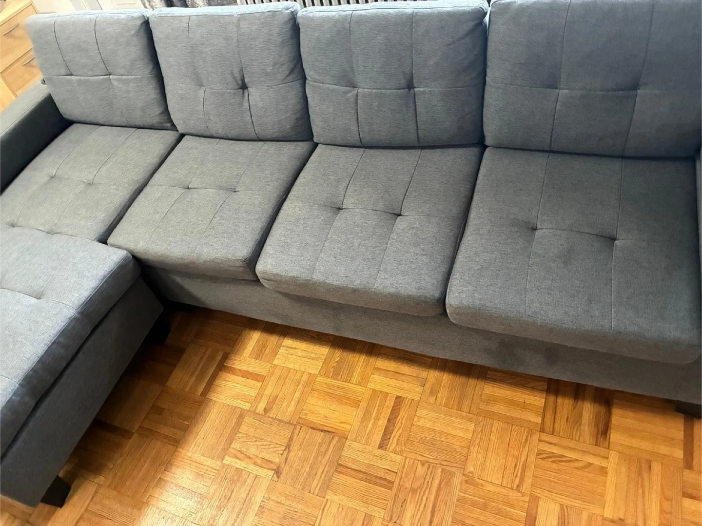 Selling a comfortable grey sectional sofa that includes an ottoman. It's in great condition and ready to add some cozy seating to your space. Perfect for lounging and relaxing after a long day!